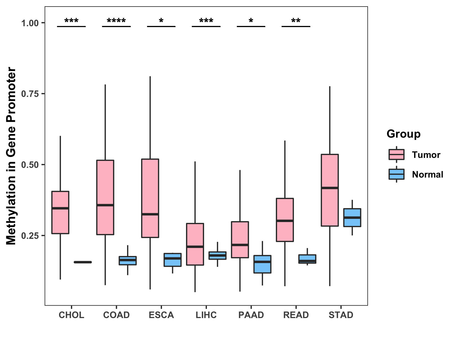 Boxplot of All Gastrointestinal Cancer ( * : 0.01-0.05 , ** : 0.005-0.01 , *** : 0.0001-0.005 , **** : < 0.0001 ) |