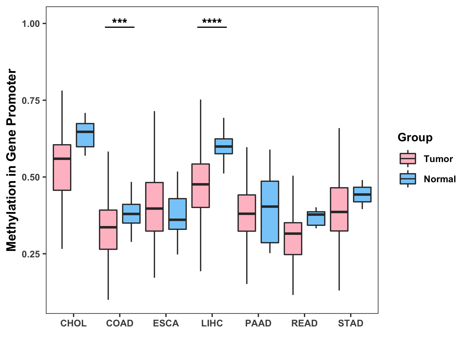 Boxplot of All Gastrointestinal Cancer ( * : 0.01-0.05 , ** : 0.005-0.01 , *** : 0.0001-0.005 , **** : < 0.0001 ) |
