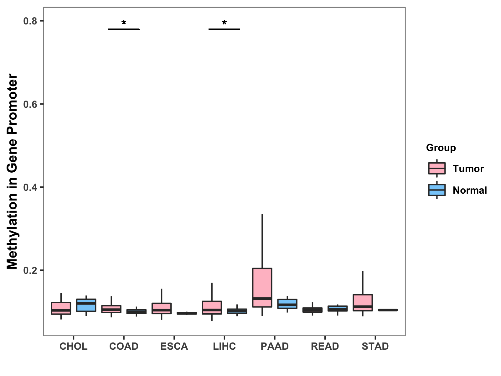 Boxplot of All Gastrointestinal Cancer ( * : 0.01-0.05 , ** : 0.005-0.01 , *** : 0.0001-0.005 , **** : < 0.0001 ) |