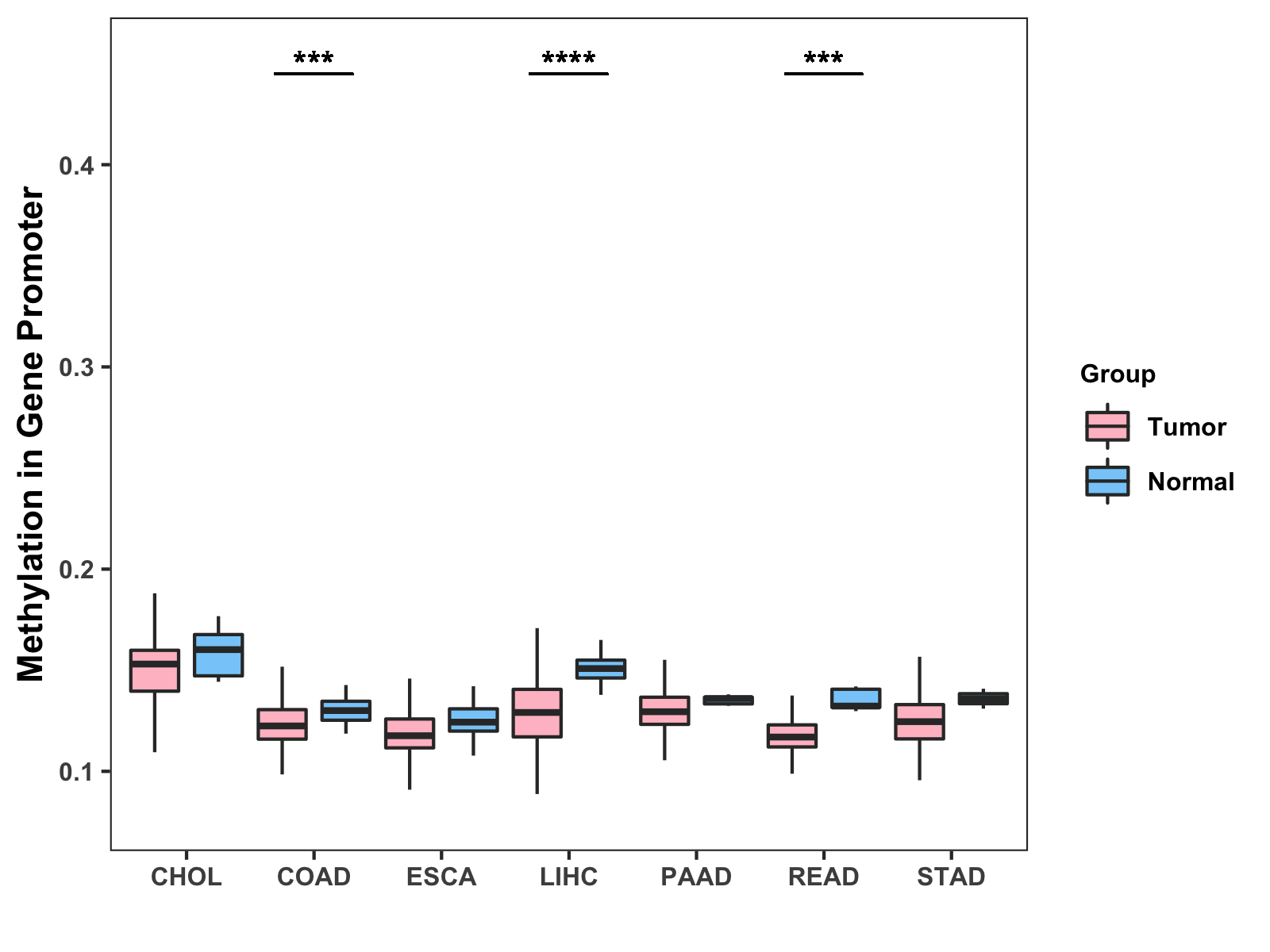 Boxplot of All Gastrointestinal Cancer ( * : 0.01-0.05 , ** : 0.005-0.01 , *** : 0.0001-0.005 , **** : < 0.0001 ) |