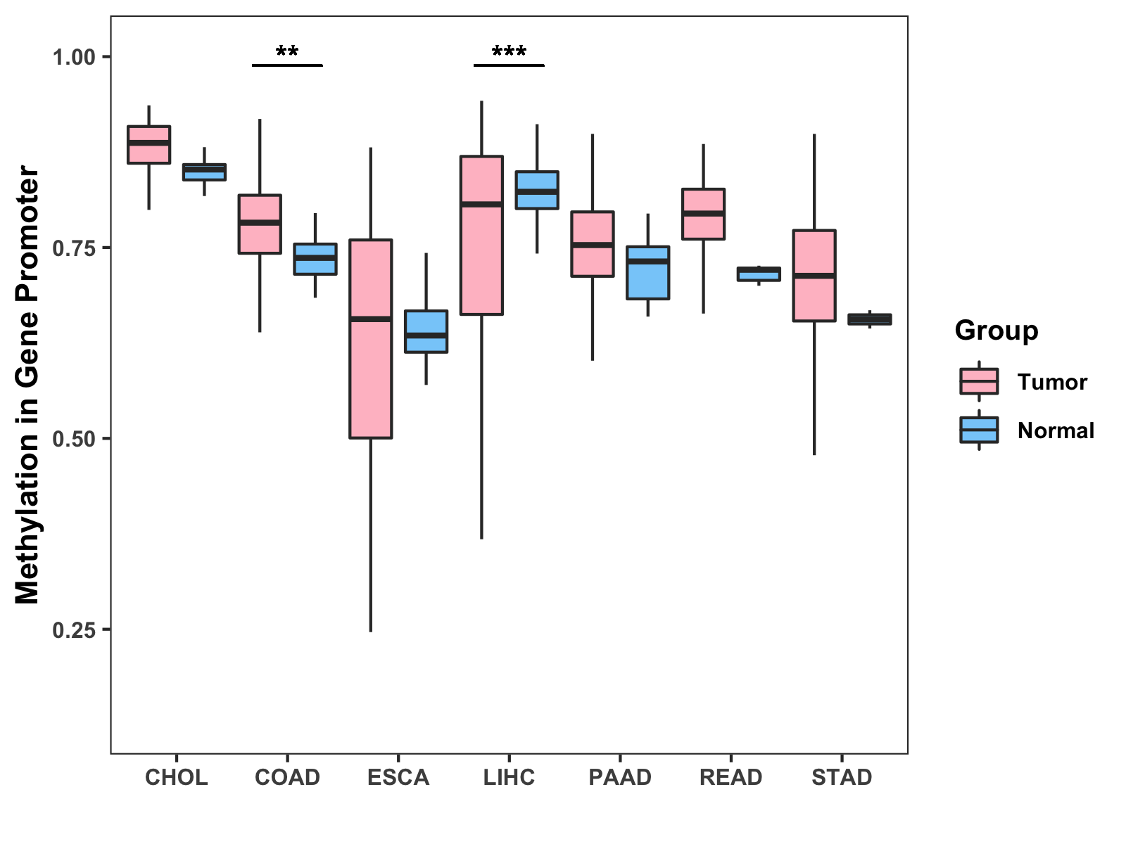 Boxplot of All Gastrointestinal Cancer ( * : 0.01-0.05 , ** : 0.005-0.01 , *** : 0.0001-0.005 , **** : < 0.0001 ) |