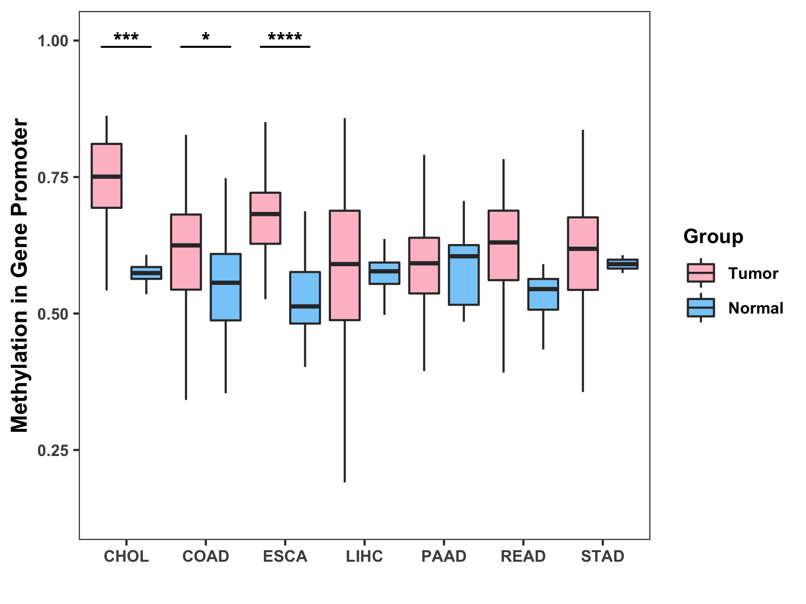 Boxplot of All Gastrointestinal Cancer ( * : 0.01-0.05 , ** : 0.005-0.01 , *** : 0.0001-0.005 , **** : < 0.0001 ) |