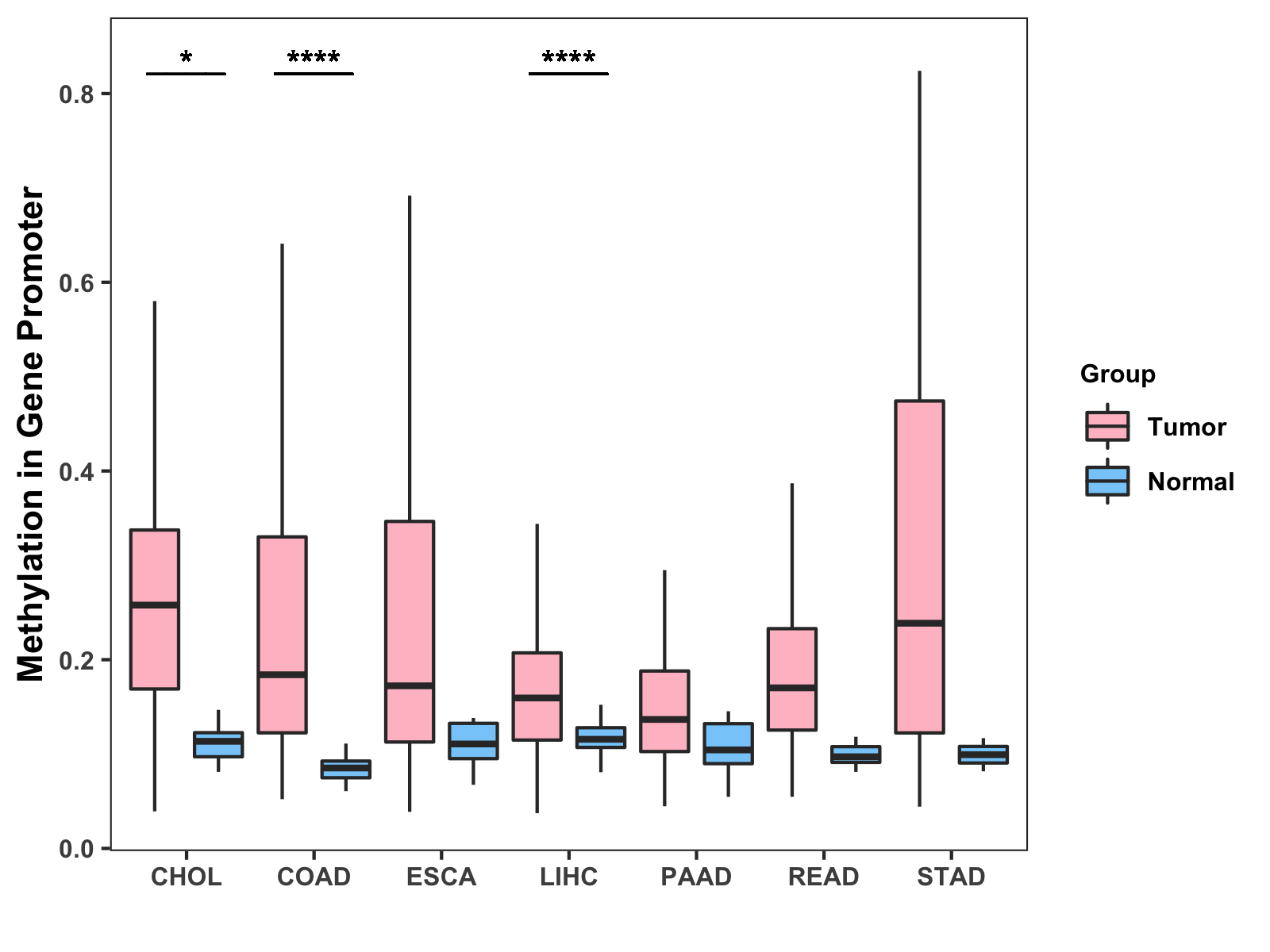 Boxplot of All Gastrointestinal Cancer ( * : 0.01-0.05 , ** : 0.005-0.01 , *** : 0.0001-0.005 , **** : < 0.0001 ) |