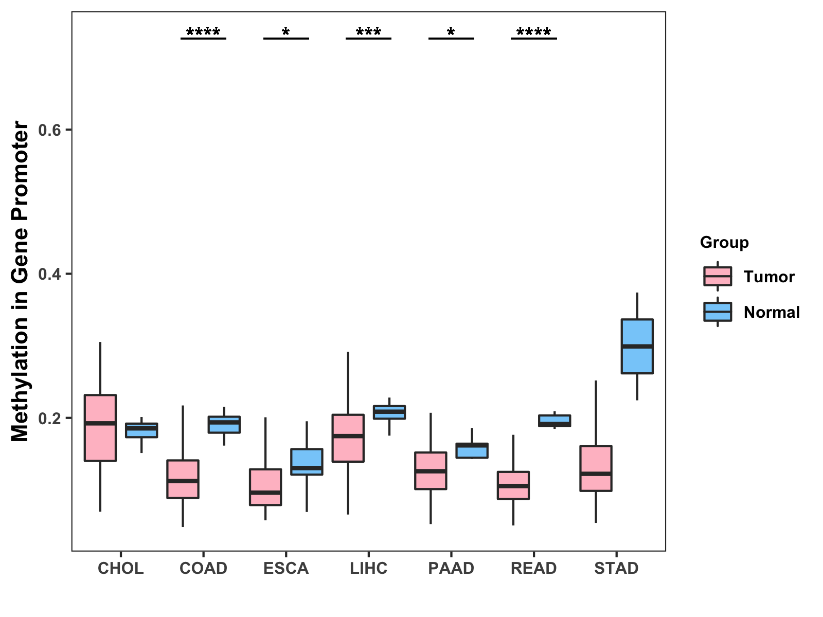 Boxplot of All Gastrointestinal Cancer ( * : 0.01-0.05 , ** : 0.005-0.01 , *** : 0.0001-0.005 , **** : < 0.0001 ) |