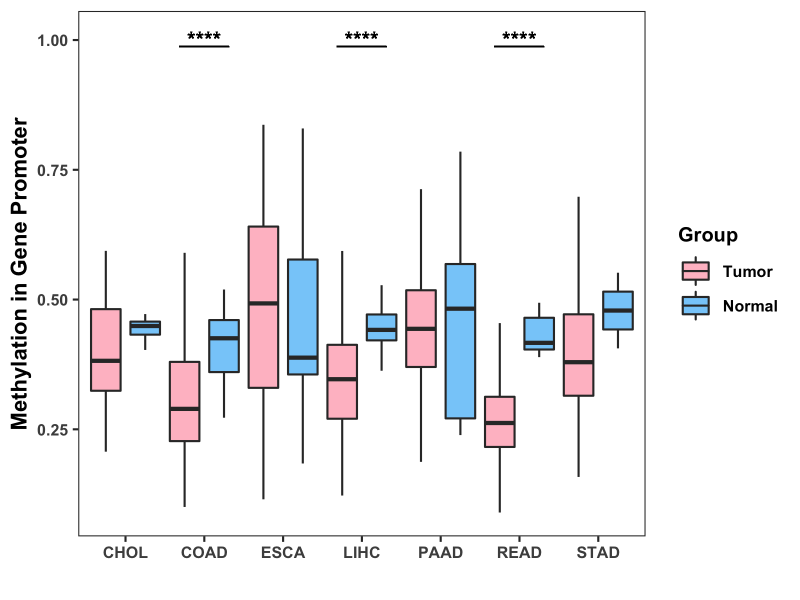 Boxplot of All Gastrointestinal Cancer ( * : 0.01-0.05 , ** : 0.005-0.01 , *** : 0.0001-0.005 , **** : < 0.0001 ) |