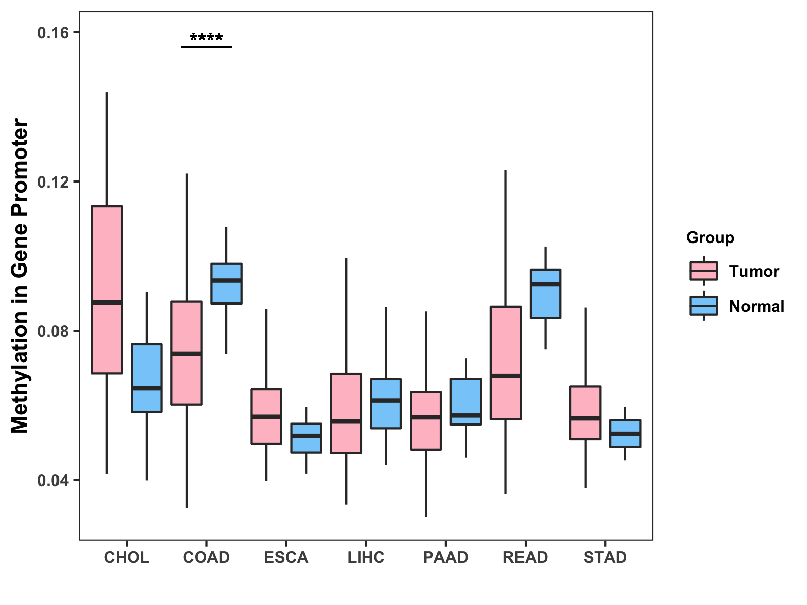 Boxplot of All Gastrointestinal Cancer ( * : 0.01-0.05 , ** : 0.005-0.01 , *** : 0.0001-0.005 , **** : < 0.0001 ) |