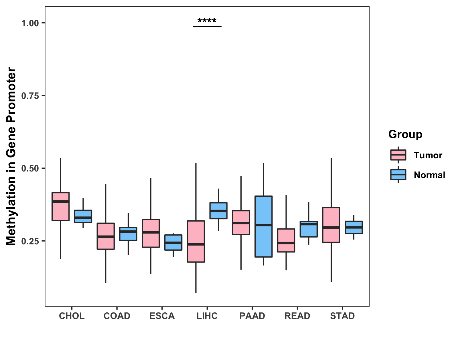 Boxplot of All Gastrointestinal Cancer ( * : 0.01-0.05 , ** : 0.005-0.01 , *** : 0.0001-0.005 , **** : < 0.0001 ) |