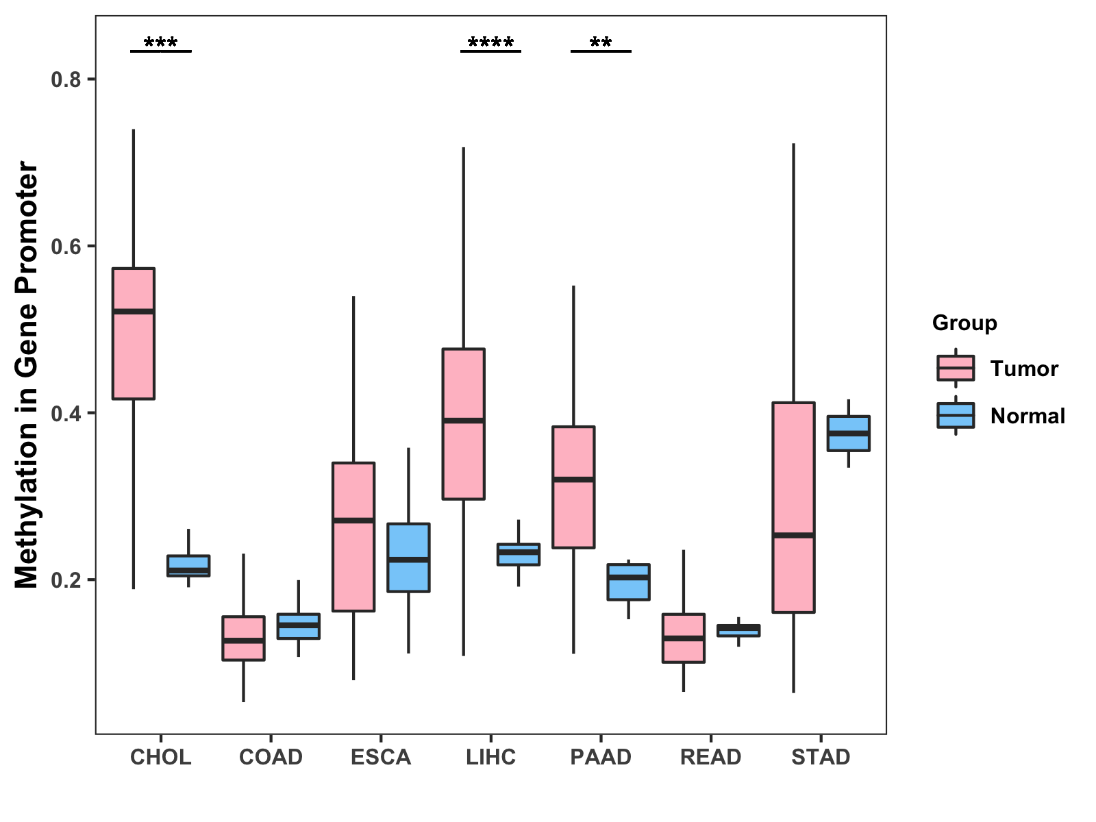 Boxplot of All Gastrointestinal Cancer ( * : 0.01-0.05 , ** : 0.005-0.01 , *** : 0.0001-0.005 , **** : < 0.0001 ) |