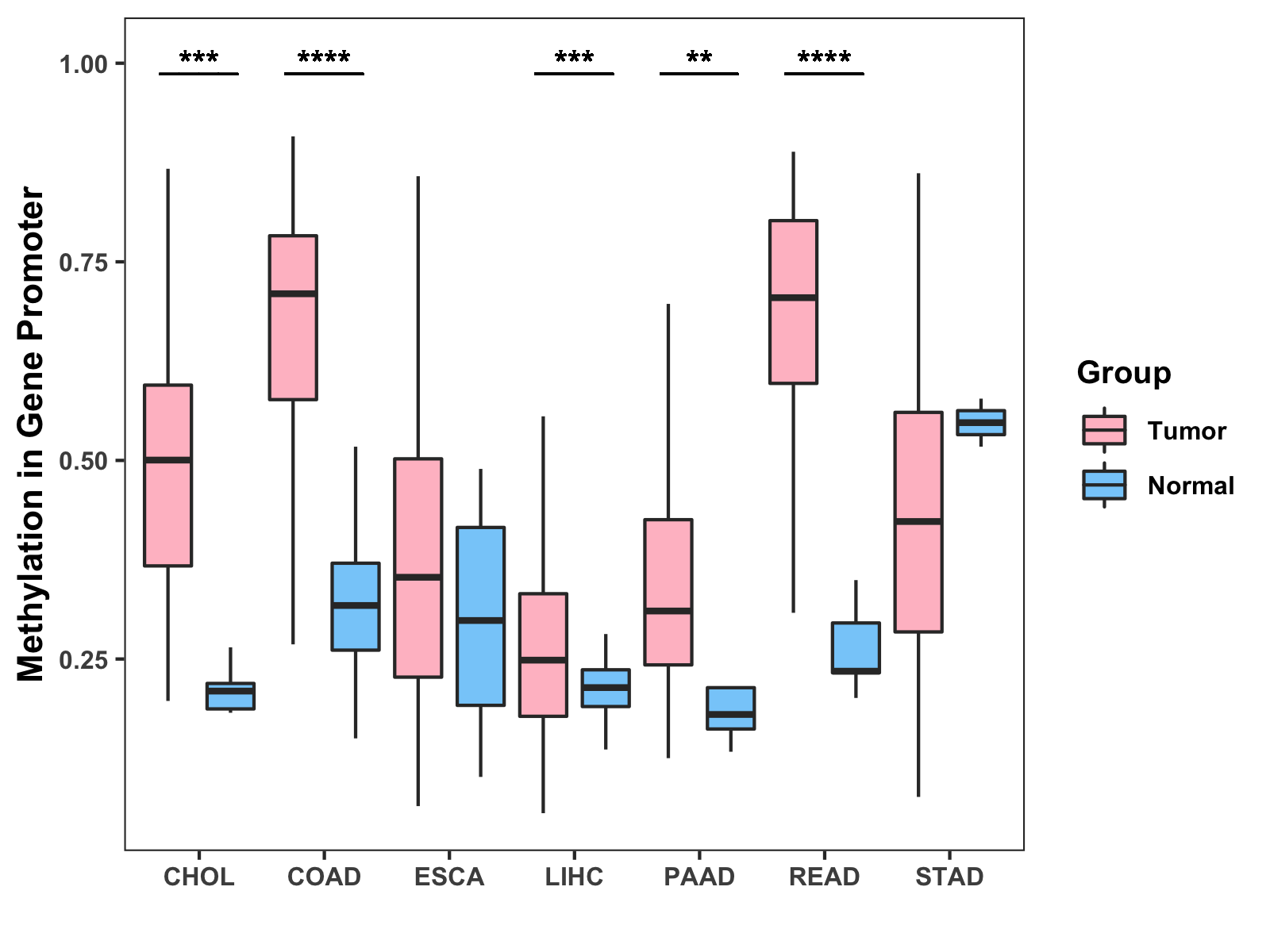 Boxplot of All Gastrointestinal Cancer ( * : 0.01-0.05 , ** : 0.005-0.01 , *** : 0.0001-0.005 , **** : < 0.0001 ) |