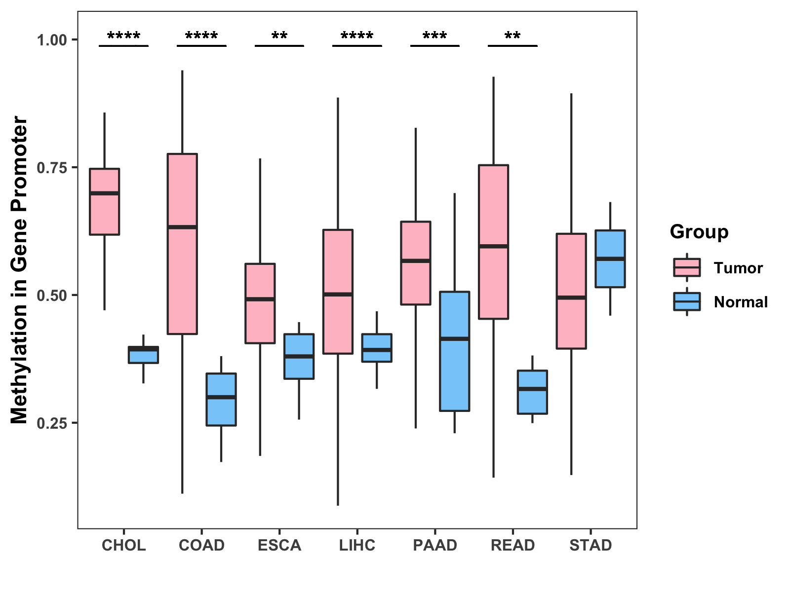 Boxplot of All Gastrointestinal Cancer ( * : 0.01-0.05 , ** : 0.005-0.01 , *** : 0.0001-0.005 , **** : < 0.0001 ) |