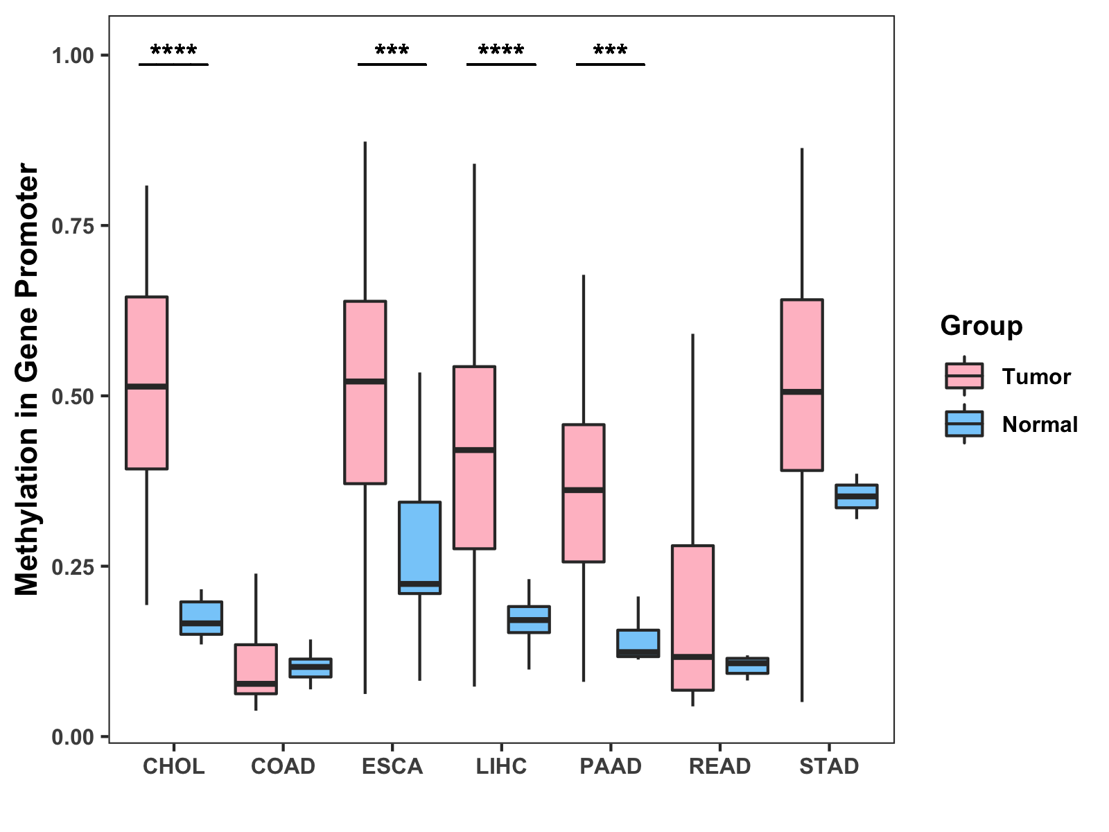 Boxplot of All Gastrointestinal Cancer ( * : 0.01-0.05 , ** : 0.005-0.01 , *** : 0.0001-0.005 , **** : < 0.0001 ) |