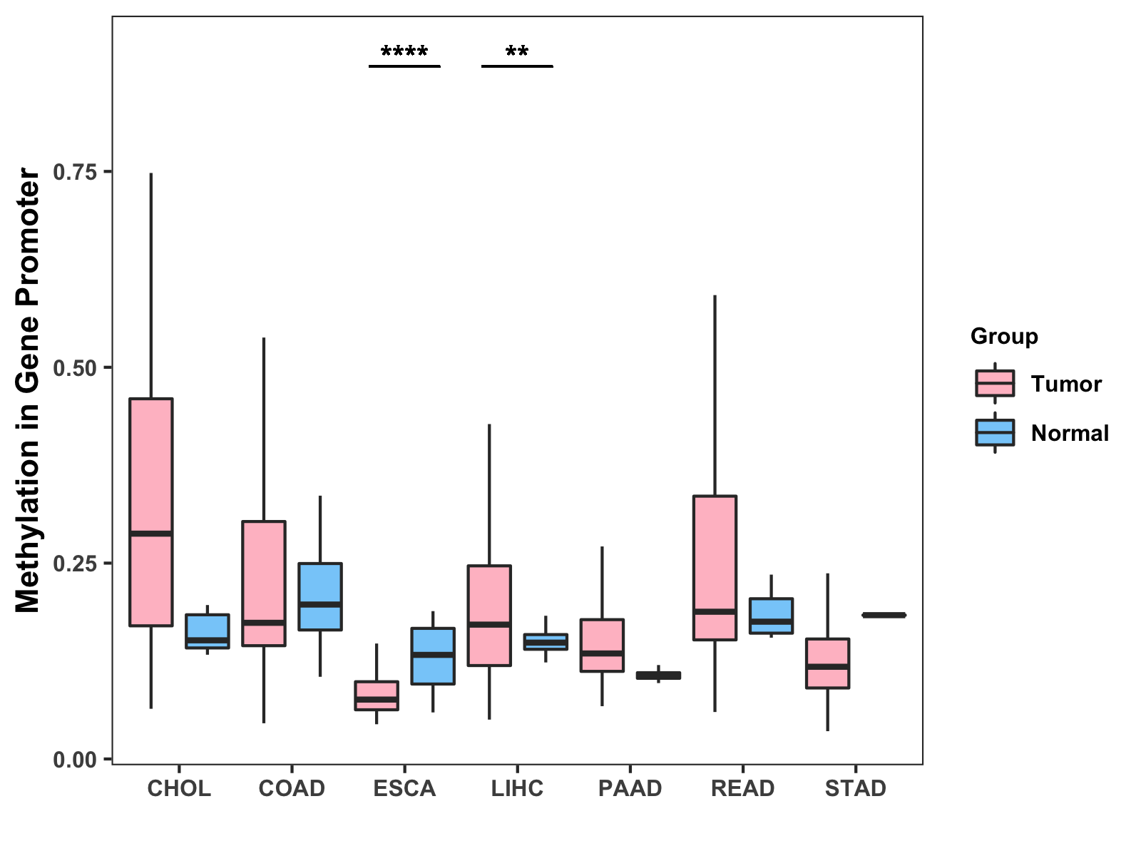 Boxplot of All Gastrointestinal Cancer ( * : 0.01-0.05 , ** : 0.005-0.01 , *** : 0.0001-0.005 , **** : < 0.0001 ) |