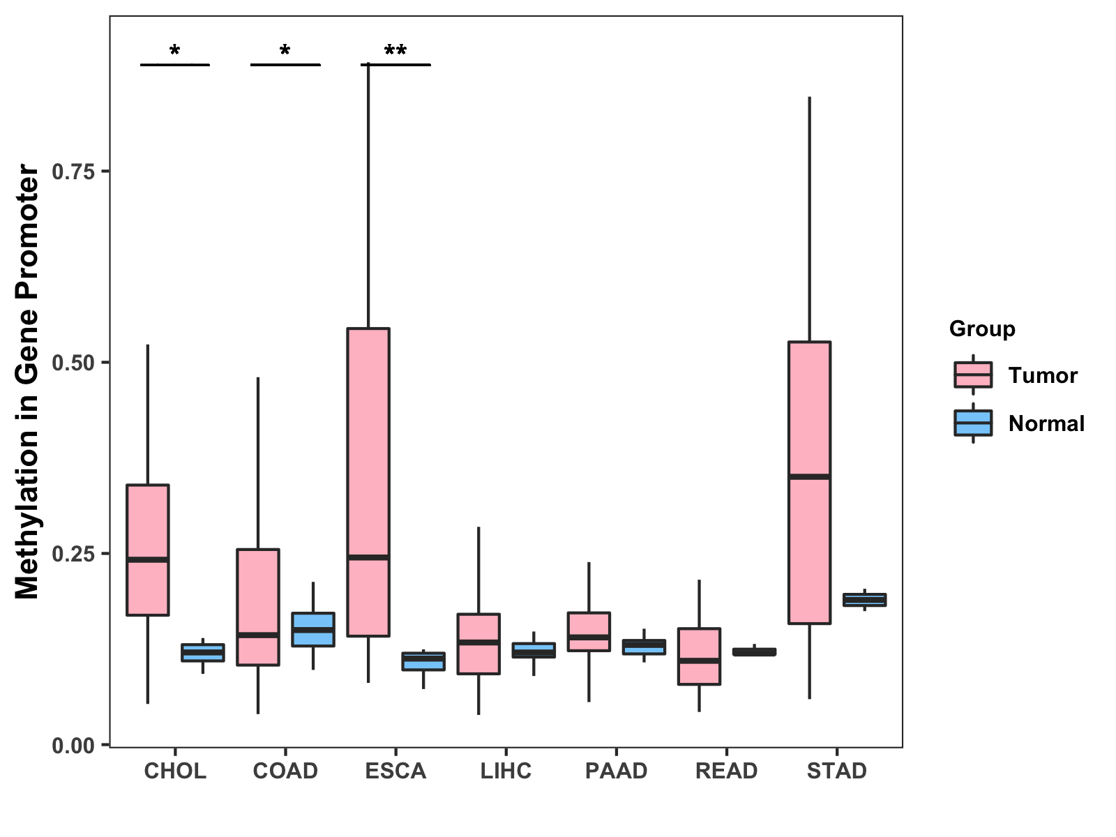 Boxplot of All Gastrointestinal Cancer ( * : 0.01-0.05 , ** : 0.005-0.01 , *** : 0.0001-0.005 , **** : < 0.0001 ) |