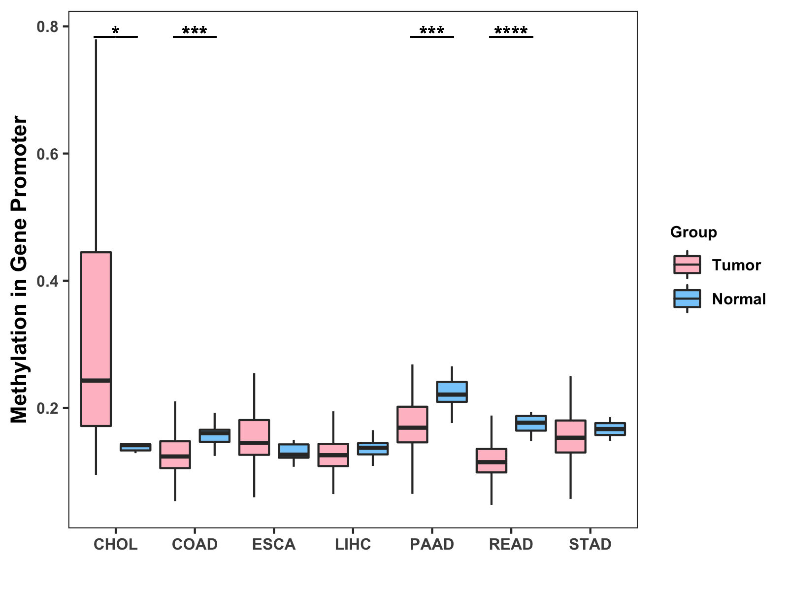 Boxplot of All Gastrointestinal Cancer ( * : 0.01-0.05 , ** : 0.005-0.01 , *** : 0.0001-0.005 , **** : < 0.0001 ) |