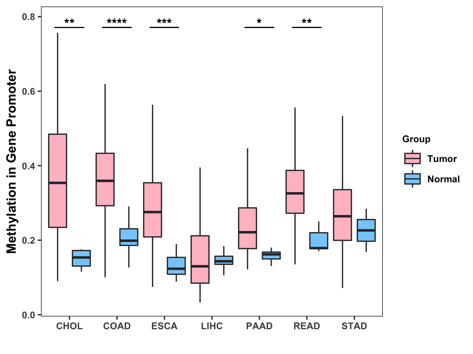 Boxplot of All Gastrointestinal Cancer ( * : 0.01-0.05 , ** : 0.005-0.01 , *** : 0.0001-0.005 , **** : < 0.0001 ) |