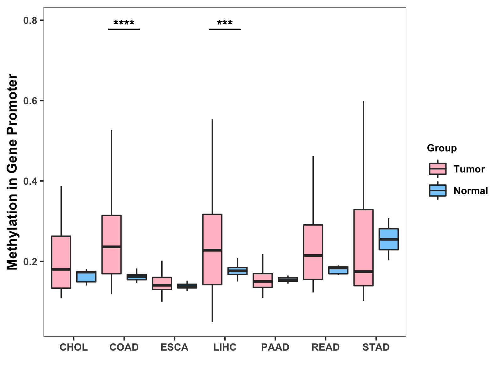 Boxplot of All Gastrointestinal Cancer ( * : 0.01-0.05 , ** : 0.005-0.01 , *** : 0.0001-0.005 , **** : < 0.0001 ) |