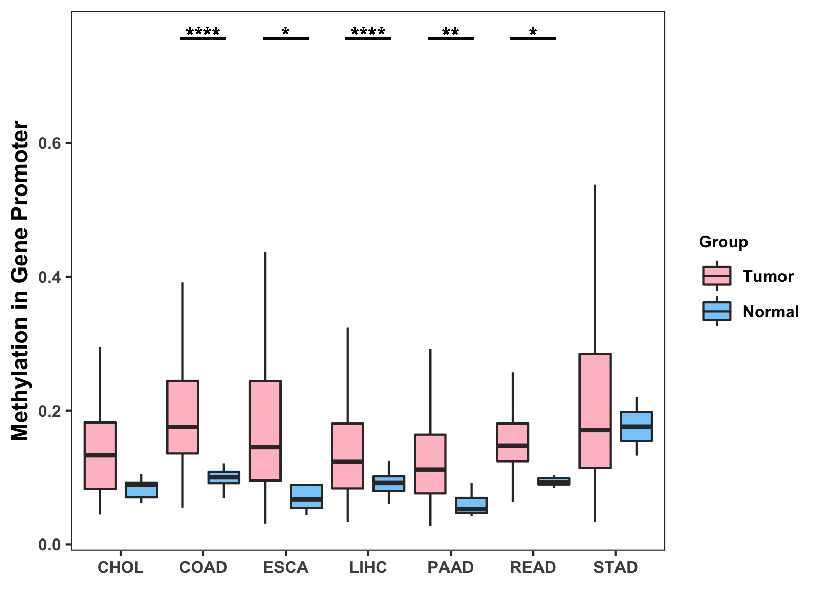 Boxplot of All Gastrointestinal Cancer ( * : 0.01-0.05 , ** : 0.005-0.01 , *** : 0.0001-0.005 , **** : < 0.0001 ) |
