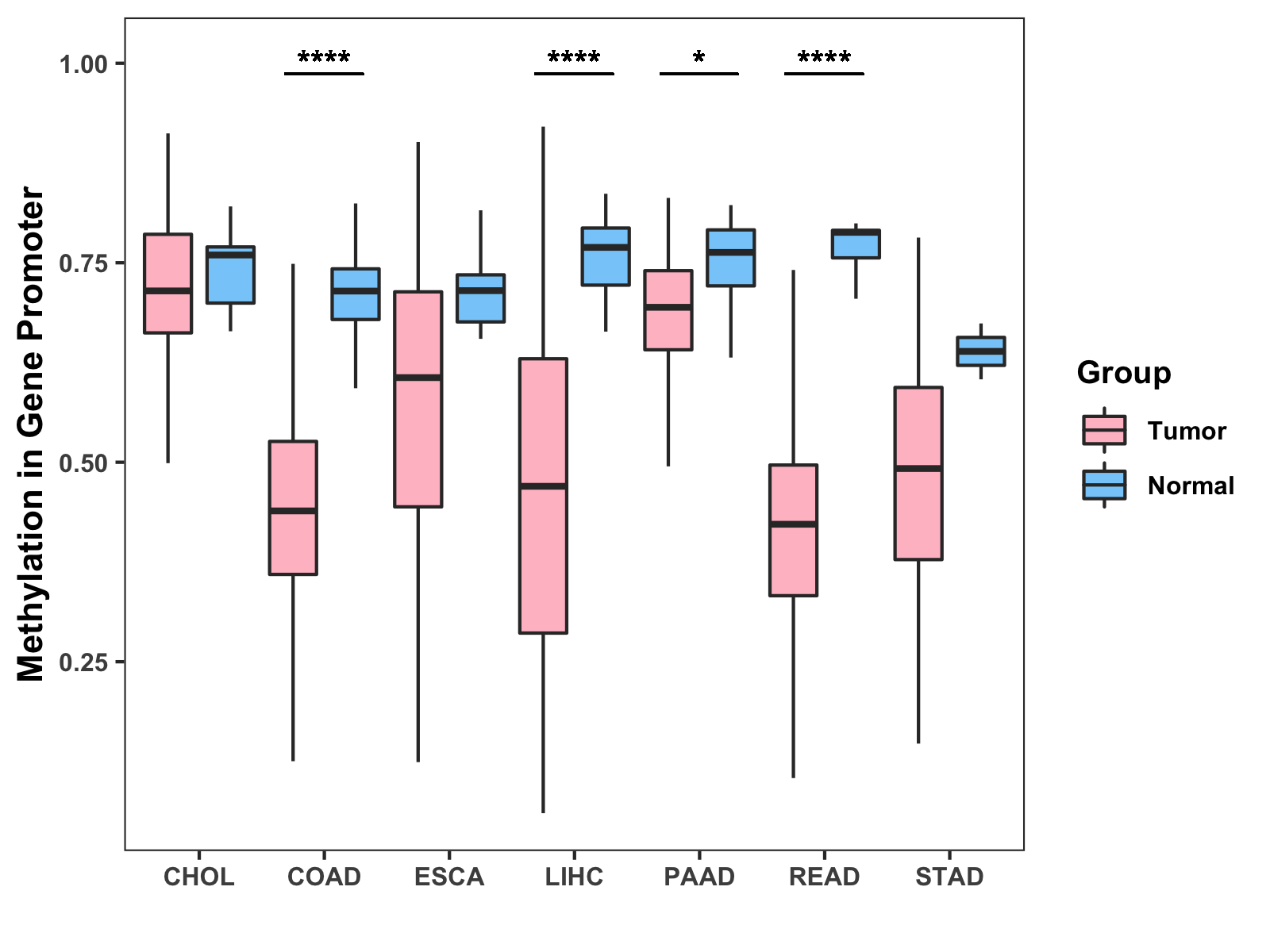 Boxplot of All Gastrointestinal Cancer ( * : 0.01-0.05 , ** : 0.005-0.01 , *** : 0.0001-0.005 , **** : < 0.0001 ) |