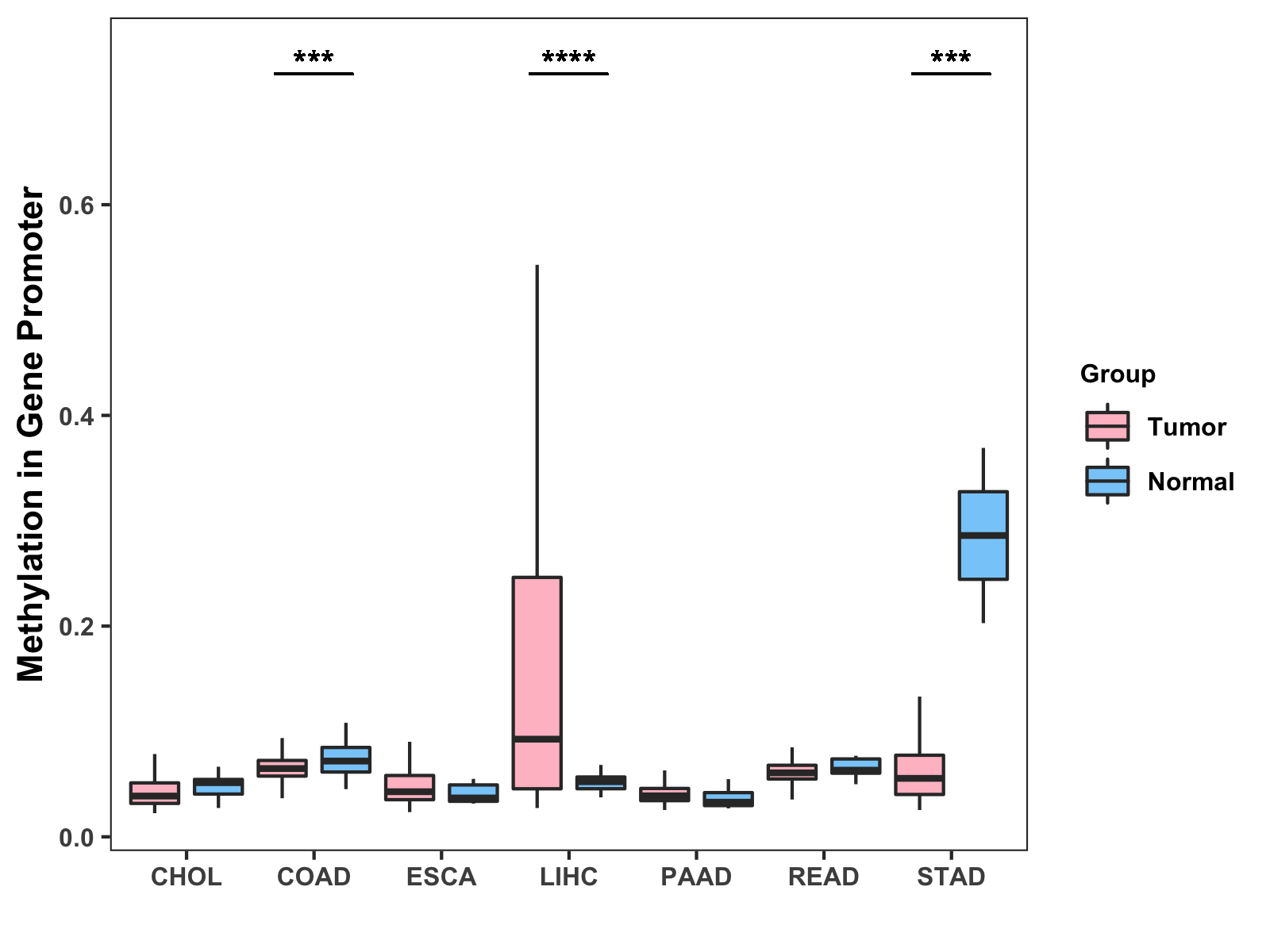 Boxplot of All Gastrointestinal Cancer ( * : 0.01-0.05 , ** : 0.005-0.01 , *** : 0.0001-0.005 , **** : < 0.0001 ) |