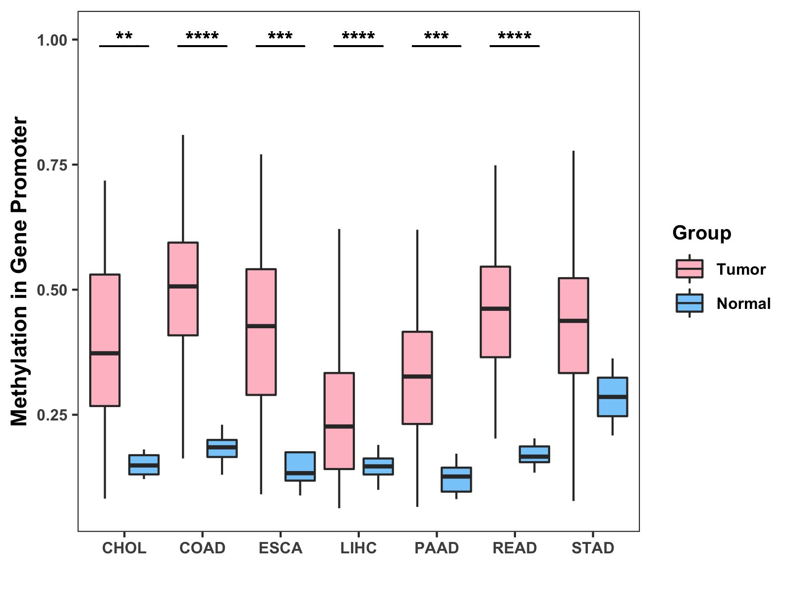 Boxplot of All Gastrointestinal Cancer ( * : 0.01-0.05 , ** : 0.005-0.01 , *** : 0.0001-0.005 , **** : < 0.0001 ) |