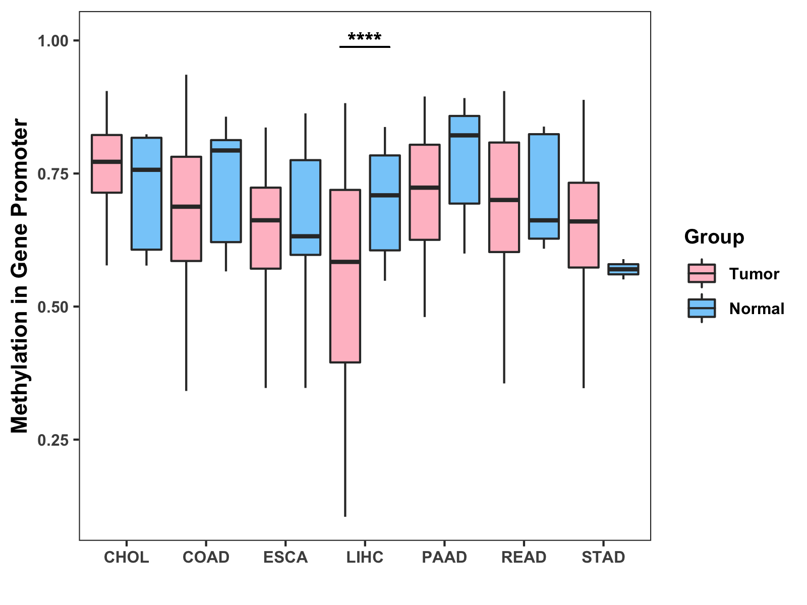 Boxplot of All Gastrointestinal Cancer ( * : 0.01-0.05 , ** : 0.005-0.01 , *** : 0.0001-0.005 , **** : < 0.0001 ) |