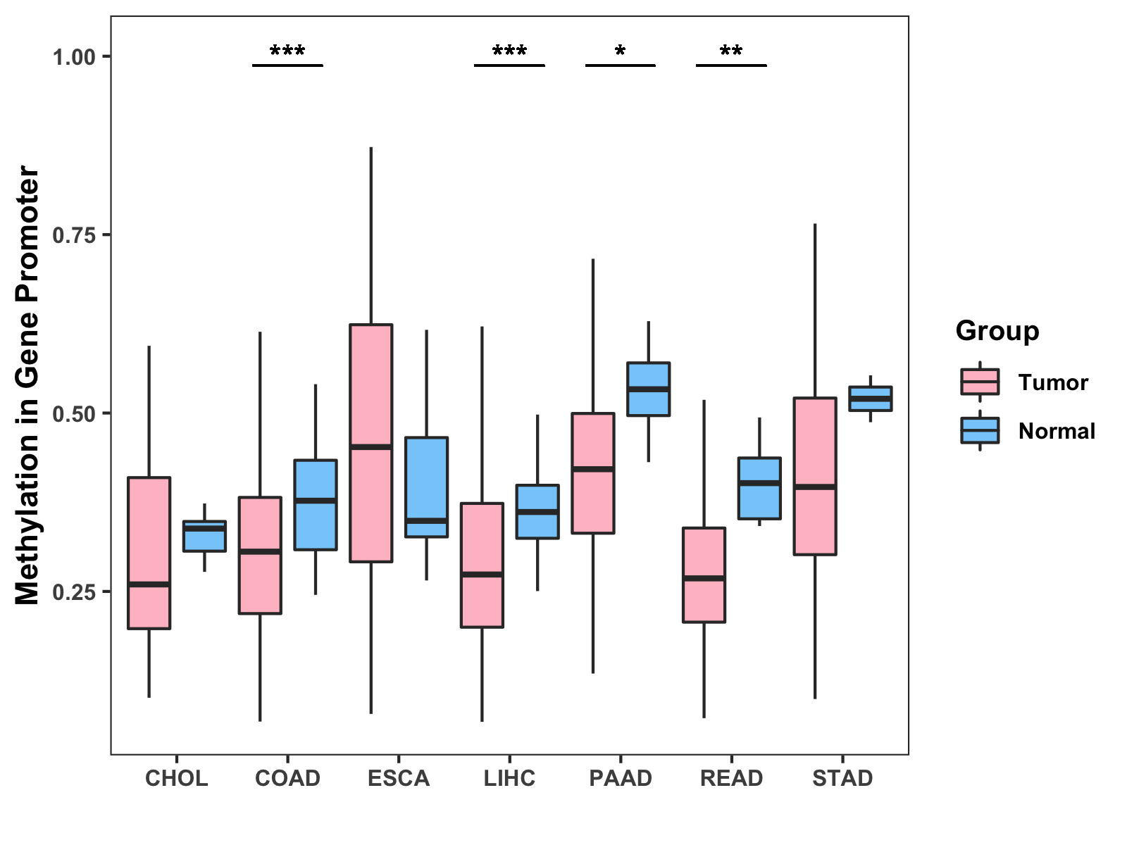 Boxplot of All Gastrointestinal Cancer ( * : 0.01-0.05 , ** : 0.005-0.01 , *** : 0.0001-0.005 , **** : < 0.0001 ) |