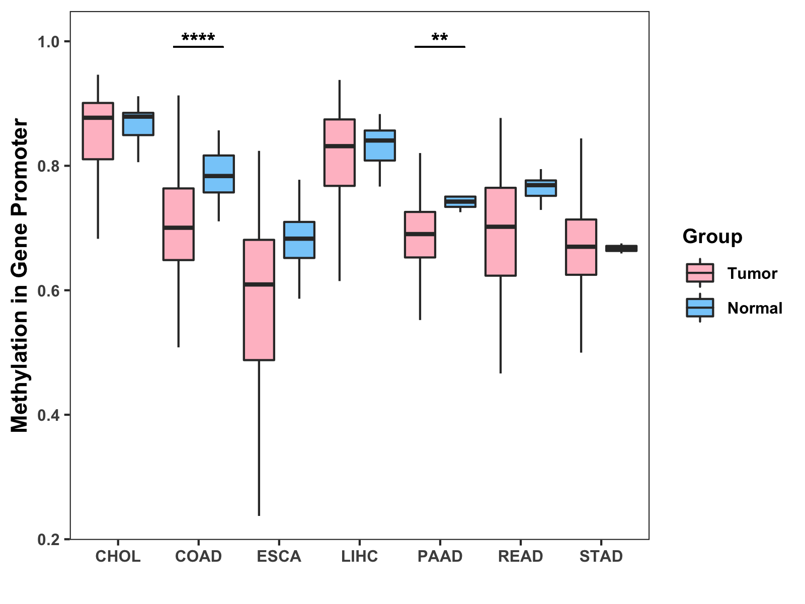 Boxplot of All Gastrointestinal Cancer ( * : 0.01-0.05 , ** : 0.005-0.01 , *** : 0.0001-0.005 , **** : < 0.0001 ) |