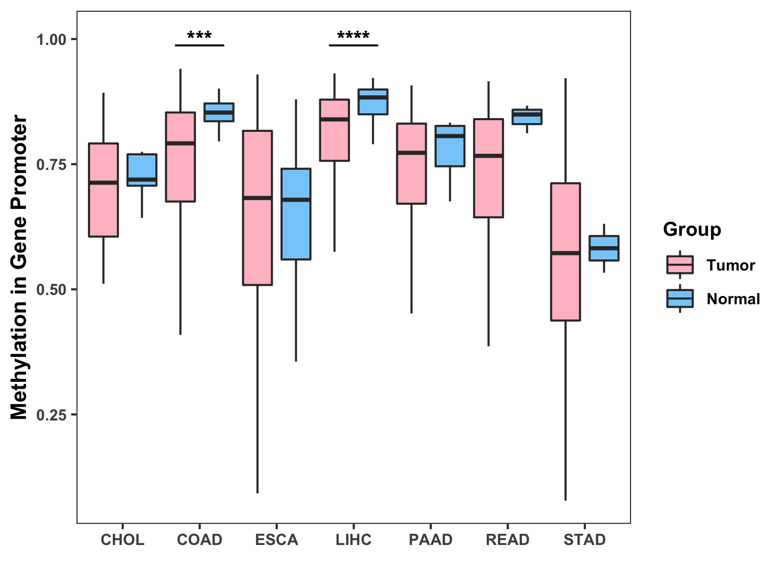 Boxplot of All Gastrointestinal Cancer ( * : 0.01-0.05 , ** : 0.005-0.01 , *** : 0.0001-0.005 , **** : < 0.0001 ) |
