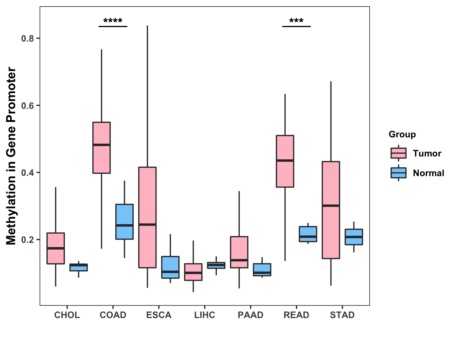 Boxplot of All Gastrointestinal Cancer ( * : 0.01-0.05 , ** : 0.005-0.01 , *** : 0.0001-0.005 , **** : < 0.0001 ) |