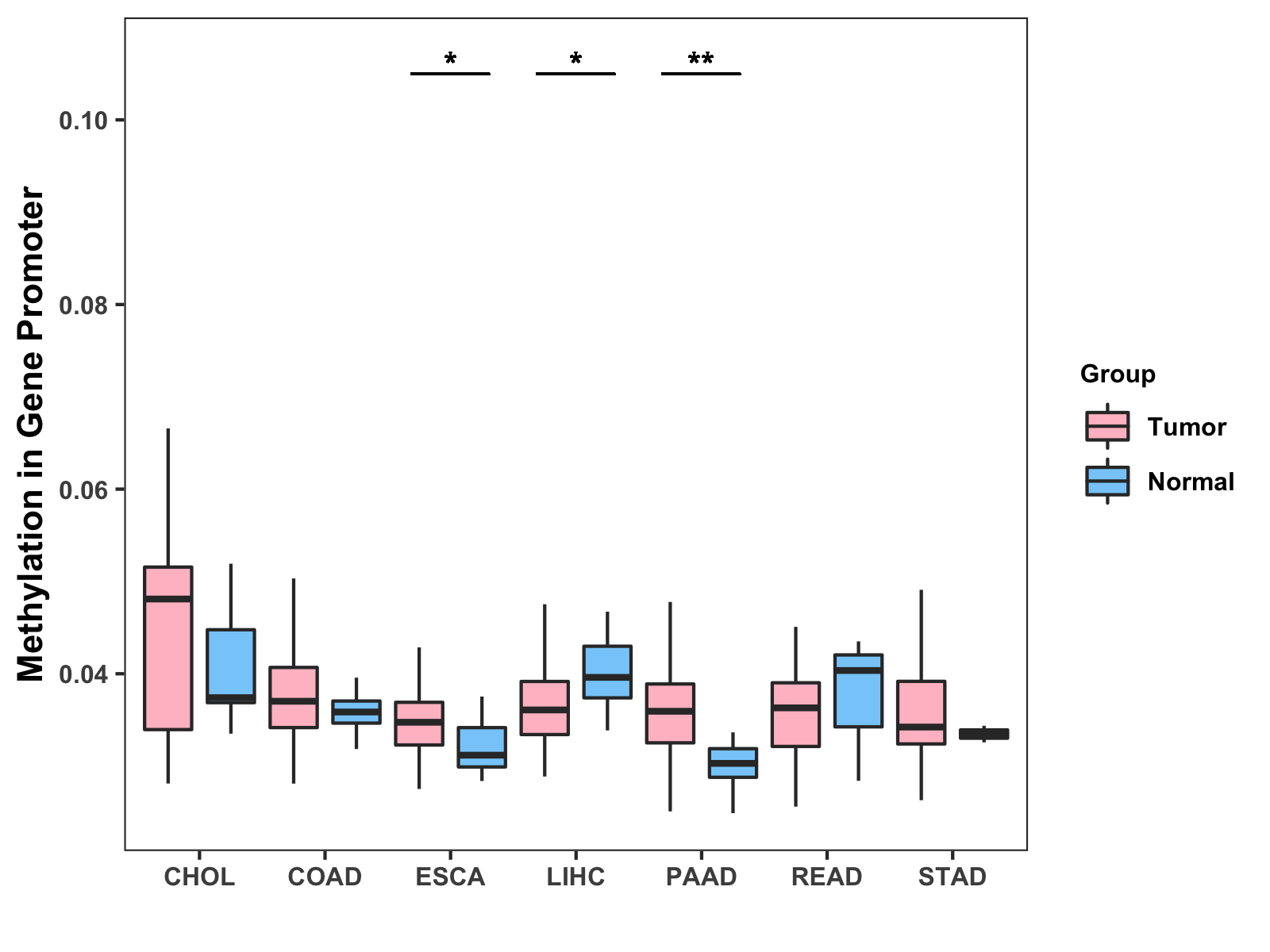 Boxplot of All Gastrointestinal Cancer ( * : 0.01-0.05 , ** : 0.005-0.01 , *** : 0.0001-0.005 , **** : < 0.0001 ) |