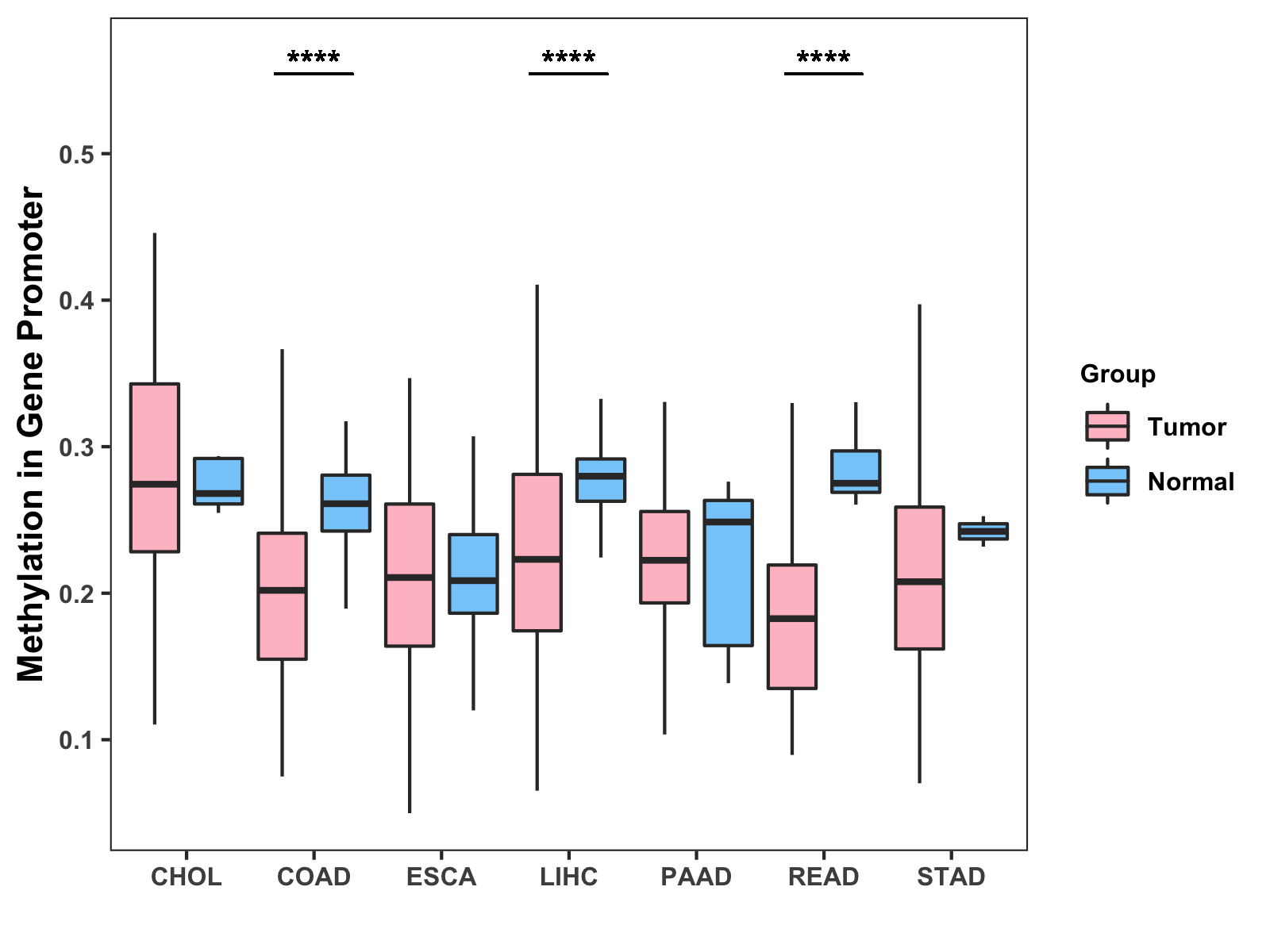 Boxplot of All Gastrointestinal Cancer ( * : 0.01-0.05 , ** : 0.005-0.01 , *** : 0.0001-0.005 , **** : < 0.0001 ) |