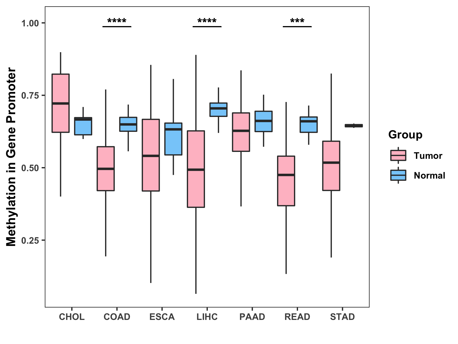 Boxplot of All Gastrointestinal Cancer ( * : 0.01-0.05 , ** : 0.005-0.01 , *** : 0.0001-0.005 , **** : < 0.0001 ) |