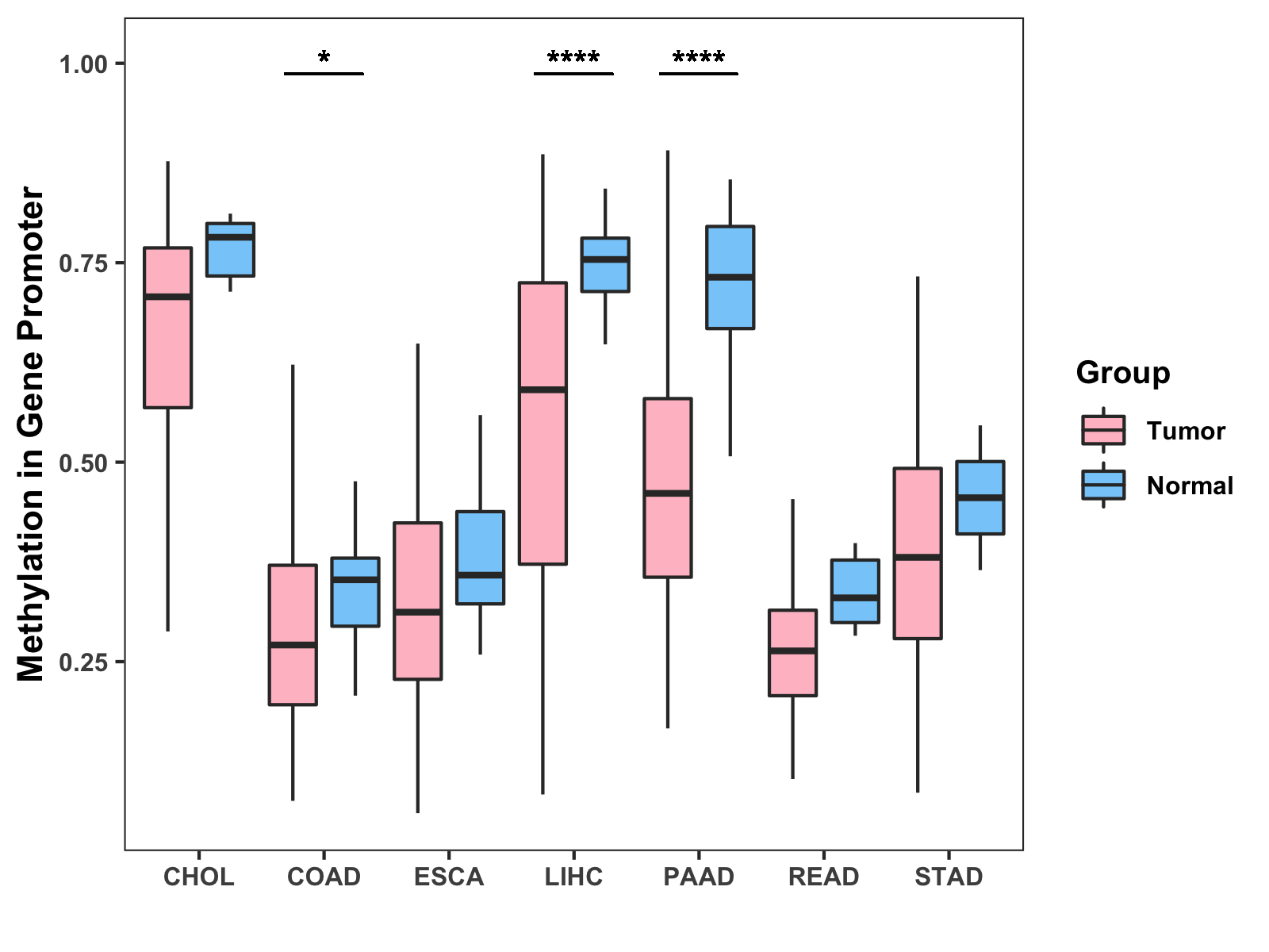 Boxplot of All Gastrointestinal Cancer ( * : 0.01-0.05 , ** : 0.005-0.01 , *** : 0.0001-0.005 , **** : < 0.0001 ) |