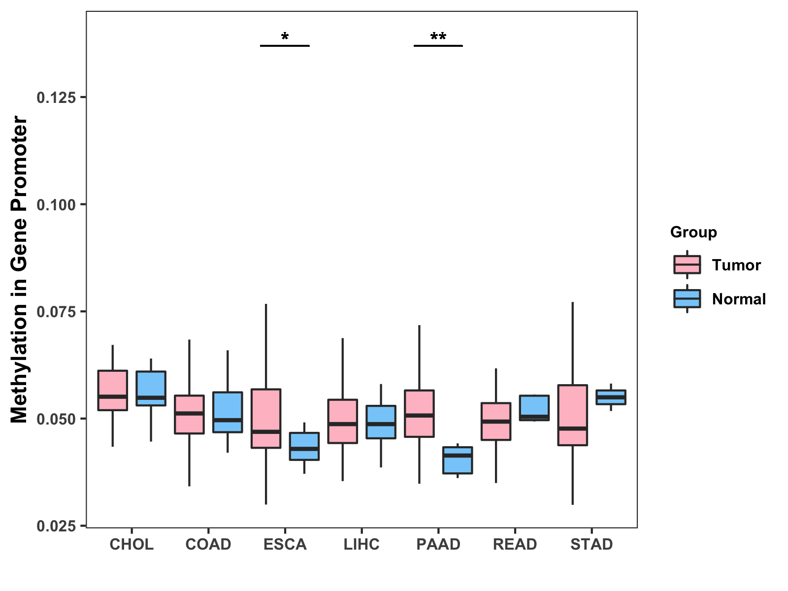 Boxplot of All Gastrointestinal Cancer ( * : 0.01-0.05 , ** : 0.005-0.01 , *** : 0.0001-0.005 , **** : < 0.0001 ) |