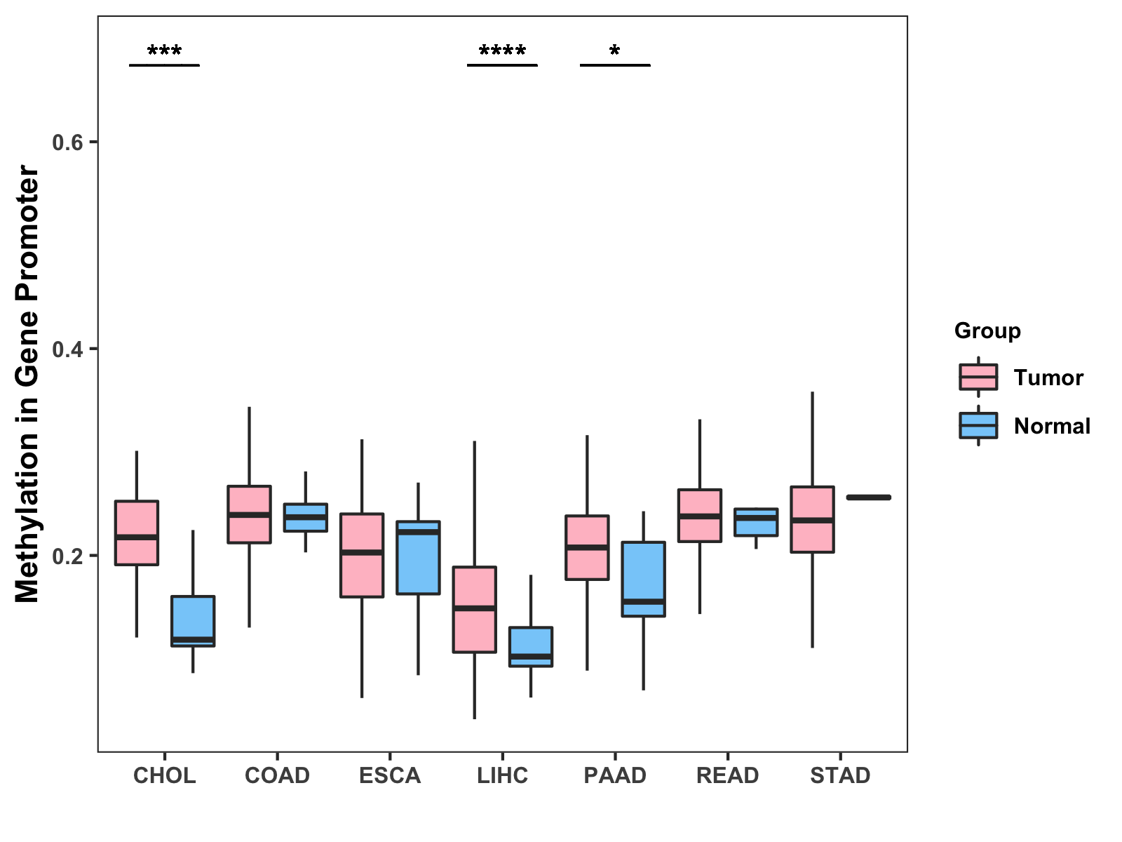 Boxplot of All Gastrointestinal Cancer ( * : 0.01-0.05 , ** : 0.005-0.01 , *** : 0.0001-0.005 , **** : < 0.0001 ) |