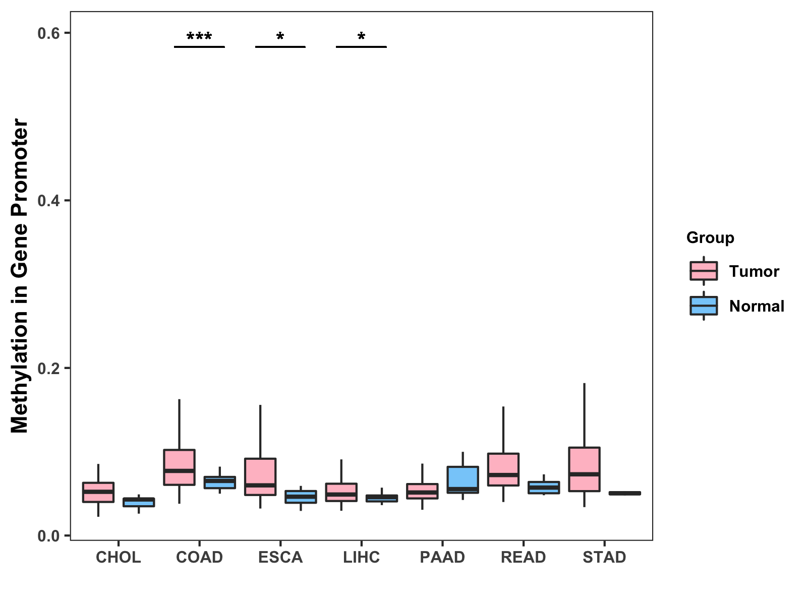 Boxplot of All Gastrointestinal Cancer ( * : 0.01-0.05 , ** : 0.005-0.01 , *** : 0.0001-0.005 , **** : < 0.0001 ) |