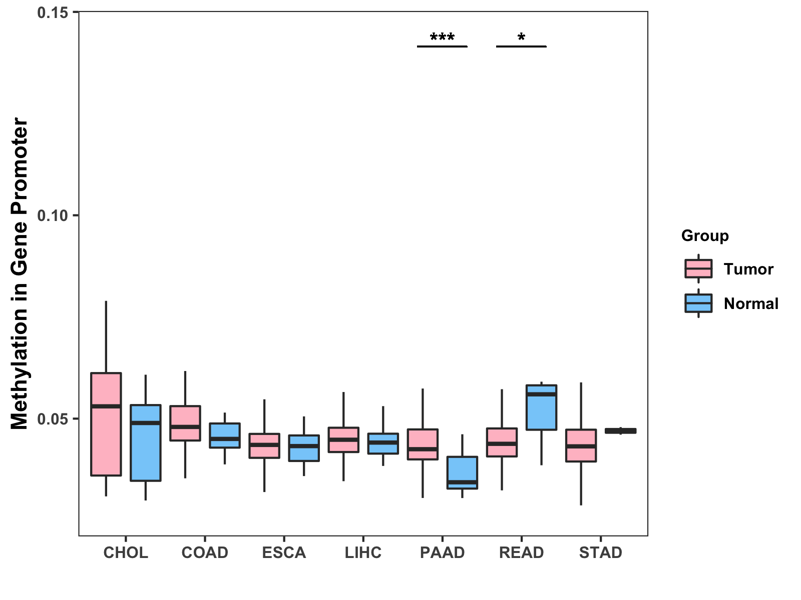 Boxplot of All Gastrointestinal Cancer ( * : 0.01-0.05 , ** : 0.005-0.01 , *** : 0.0001-0.005 , **** : < 0.0001 ) |