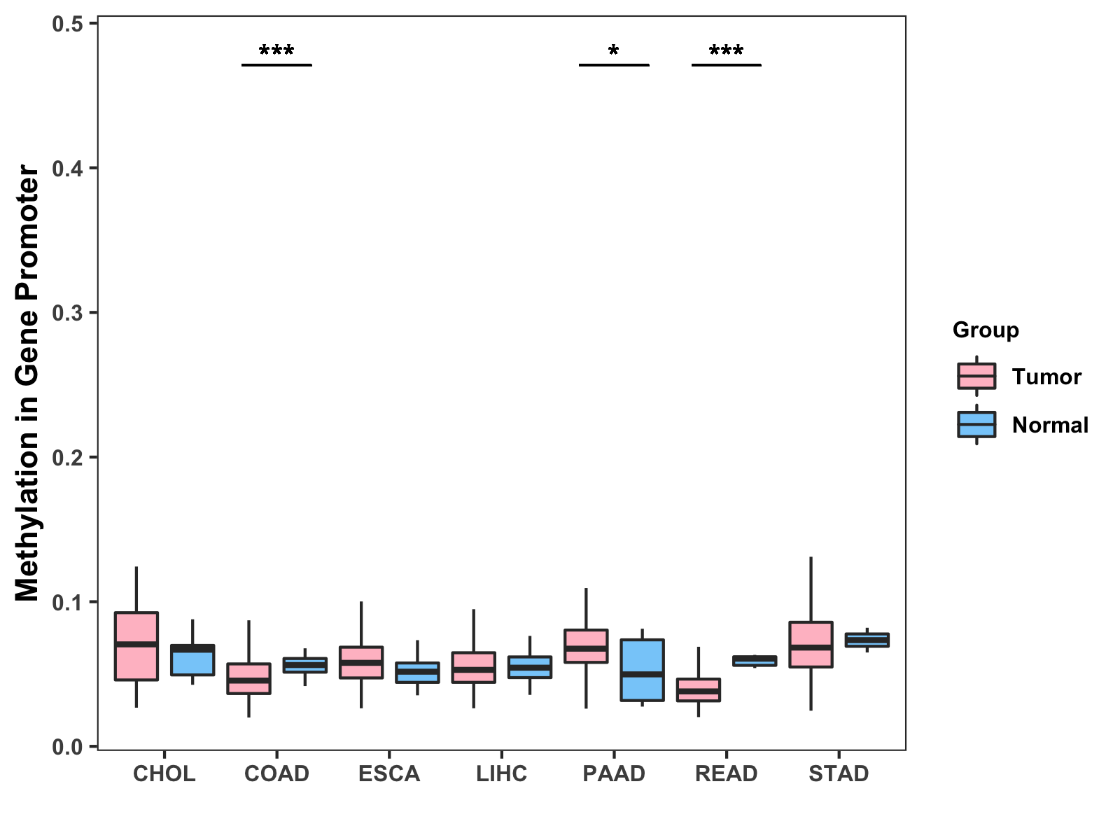Boxplot of All Gastrointestinal Cancer ( * : 0.01-0.05 , ** : 0.005-0.01 , *** : 0.0001-0.005 , **** : < 0.0001 ) |