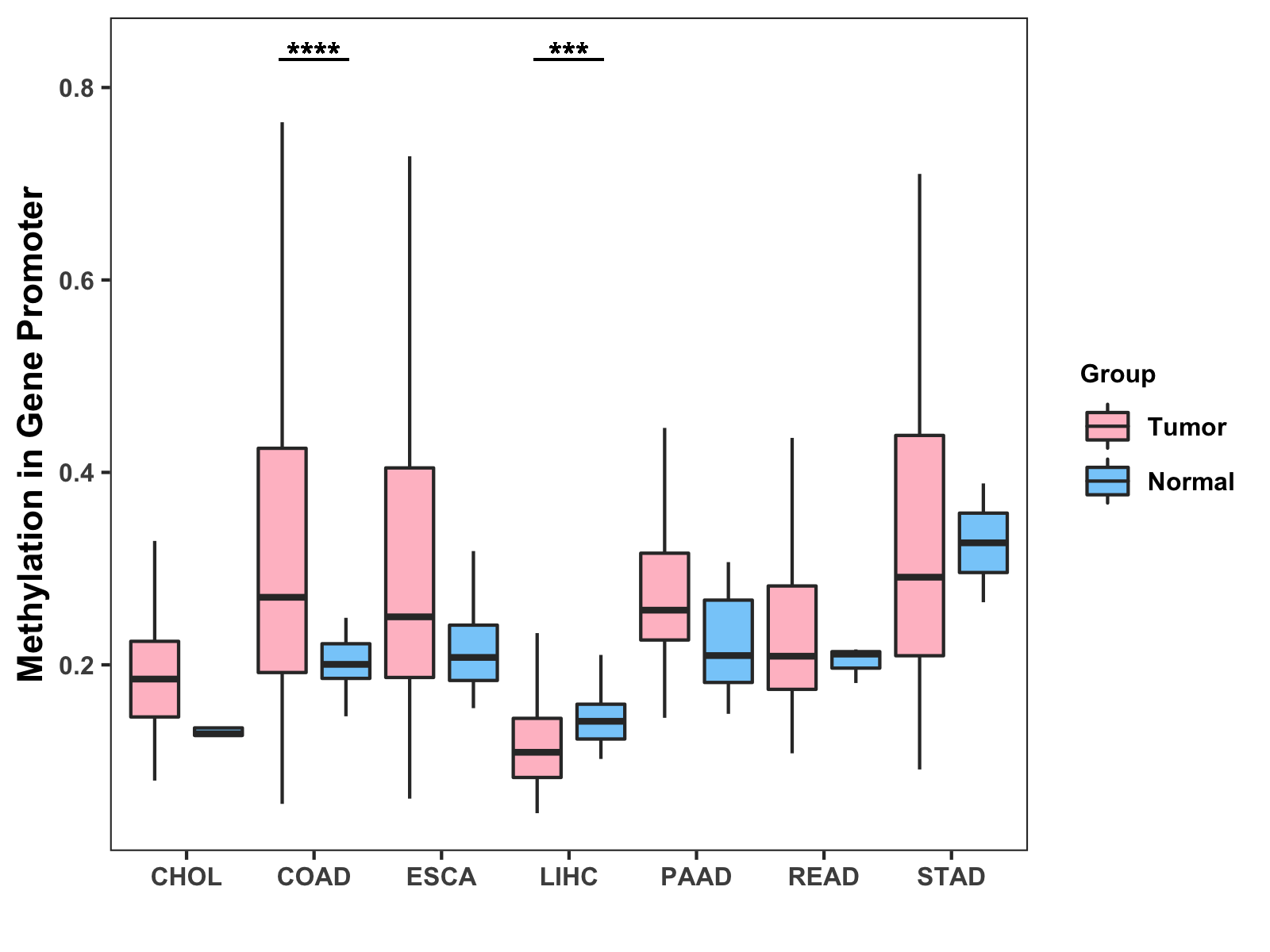 Boxplot of All Gastrointestinal Cancer ( * : 0.01-0.05 , ** : 0.005-0.01 , *** : 0.0001-0.005 , **** : < 0.0001 ) |