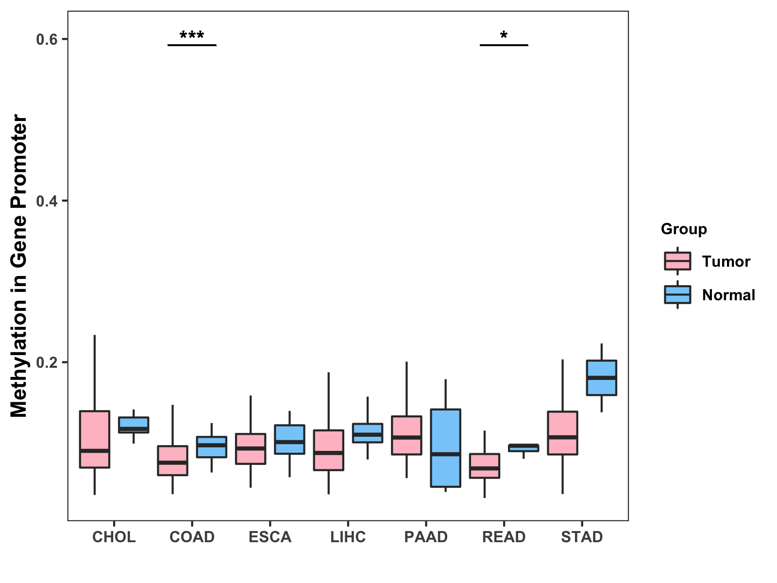 Boxplot of All Gastrointestinal Cancer ( * : 0.01-0.05 , ** : 0.005-0.01 , *** : 0.0001-0.005 , **** : < 0.0001 ) |