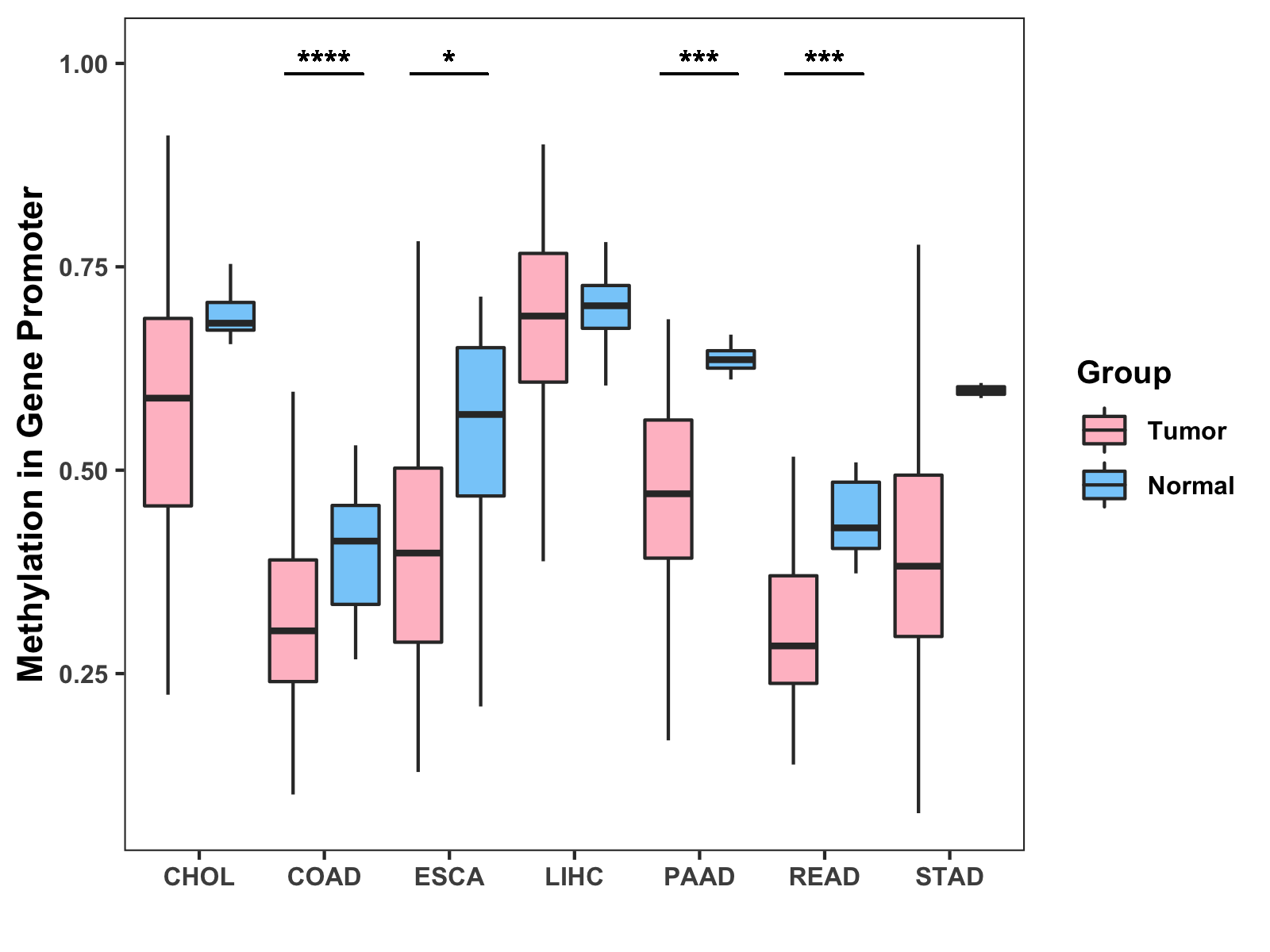Boxplot of All Gastrointestinal Cancer ( * : 0.01-0.05 , ** : 0.005-0.01 , *** : 0.0001-0.005 , **** : < 0.0001 ) |