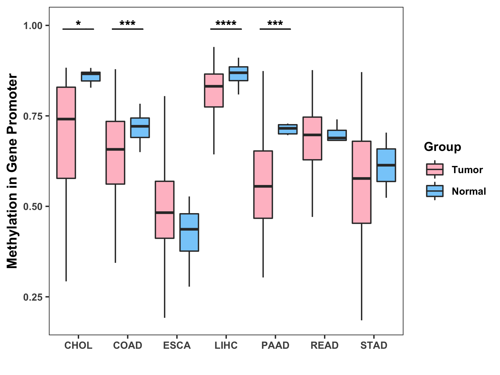 Boxplot of All Gastrointestinal Cancer ( * : 0.01-0.05 , ** : 0.005-0.01 , *** : 0.0001-0.005 , **** : < 0.0001 ) |
