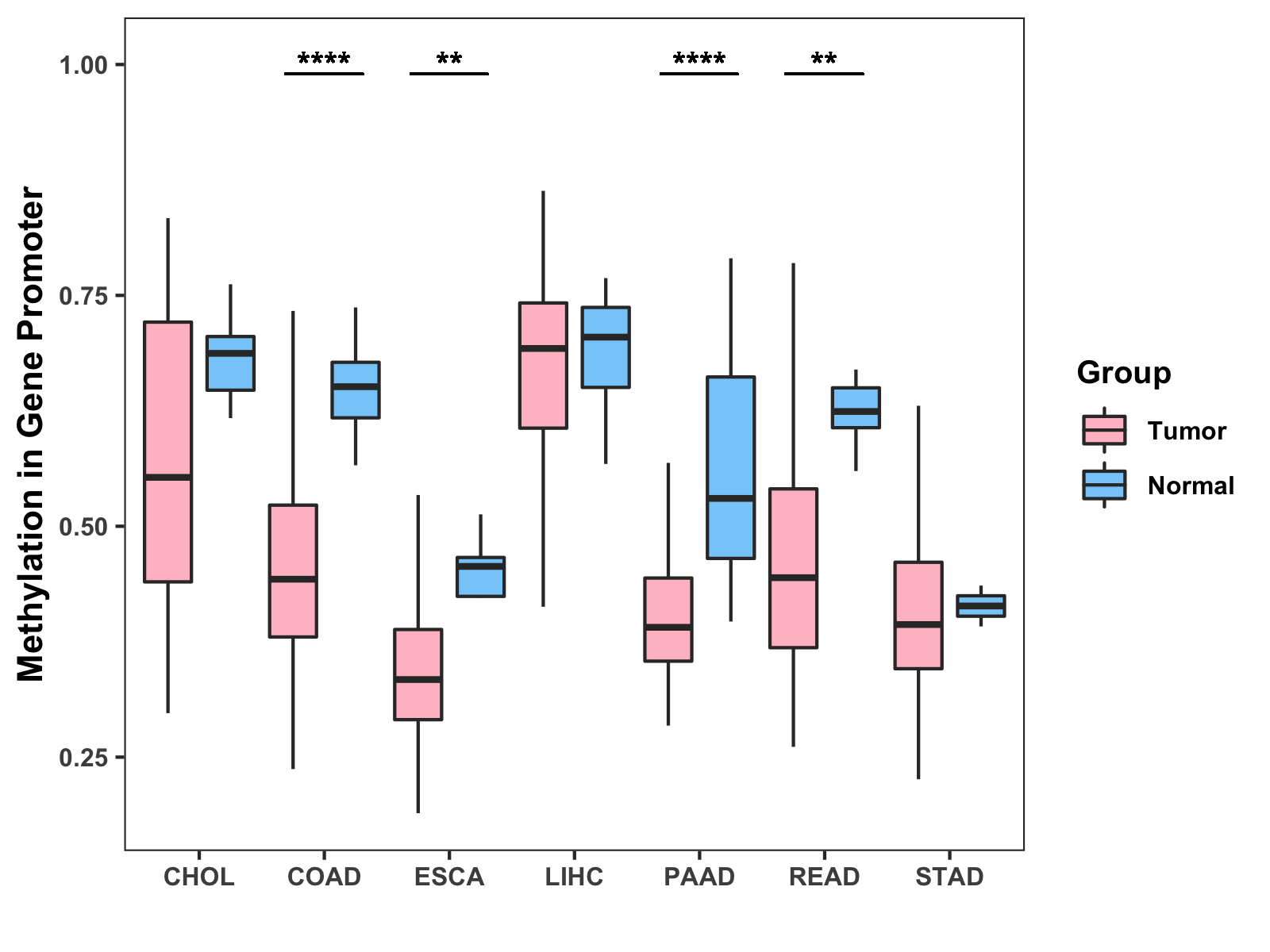 Boxplot of All Gastrointestinal Cancer ( * : 0.01-0.05 , ** : 0.005-0.01 , *** : 0.0001-0.005 , **** : < 0.0001 ) |