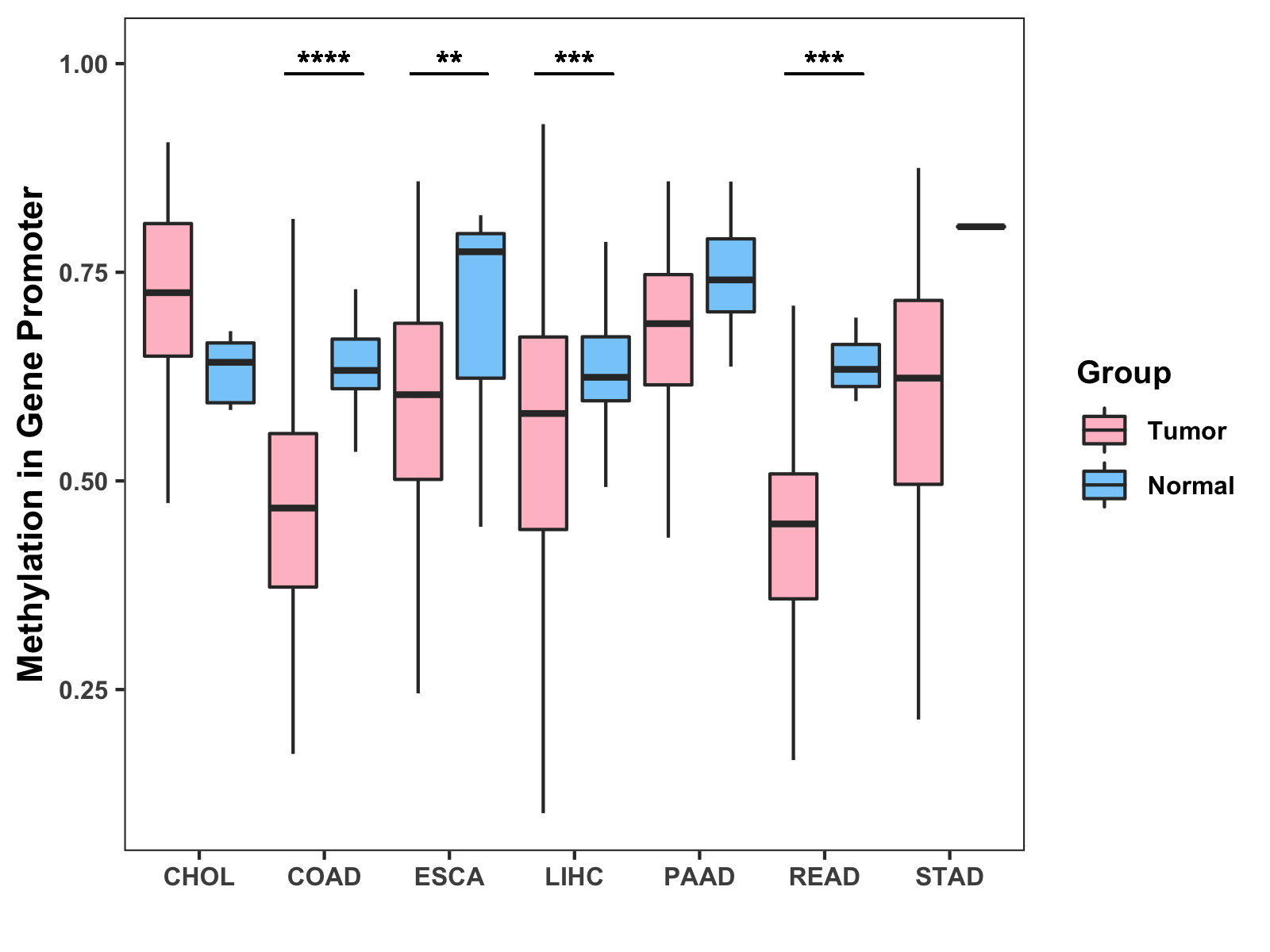 Boxplot of All Gastrointestinal Cancer ( * : 0.01-0.05 , ** : 0.005-0.01 , *** : 0.0001-0.005 , **** : < 0.0001 ) |