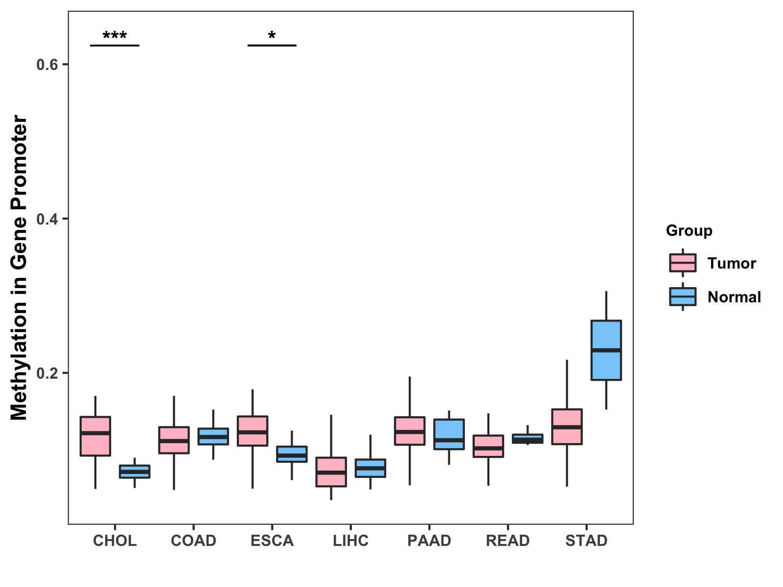 Boxplot of All Gastrointestinal Cancer ( * : 0.01-0.05 , ** : 0.005-0.01 , *** : 0.0001-0.005 , **** : < 0.0001 ) |