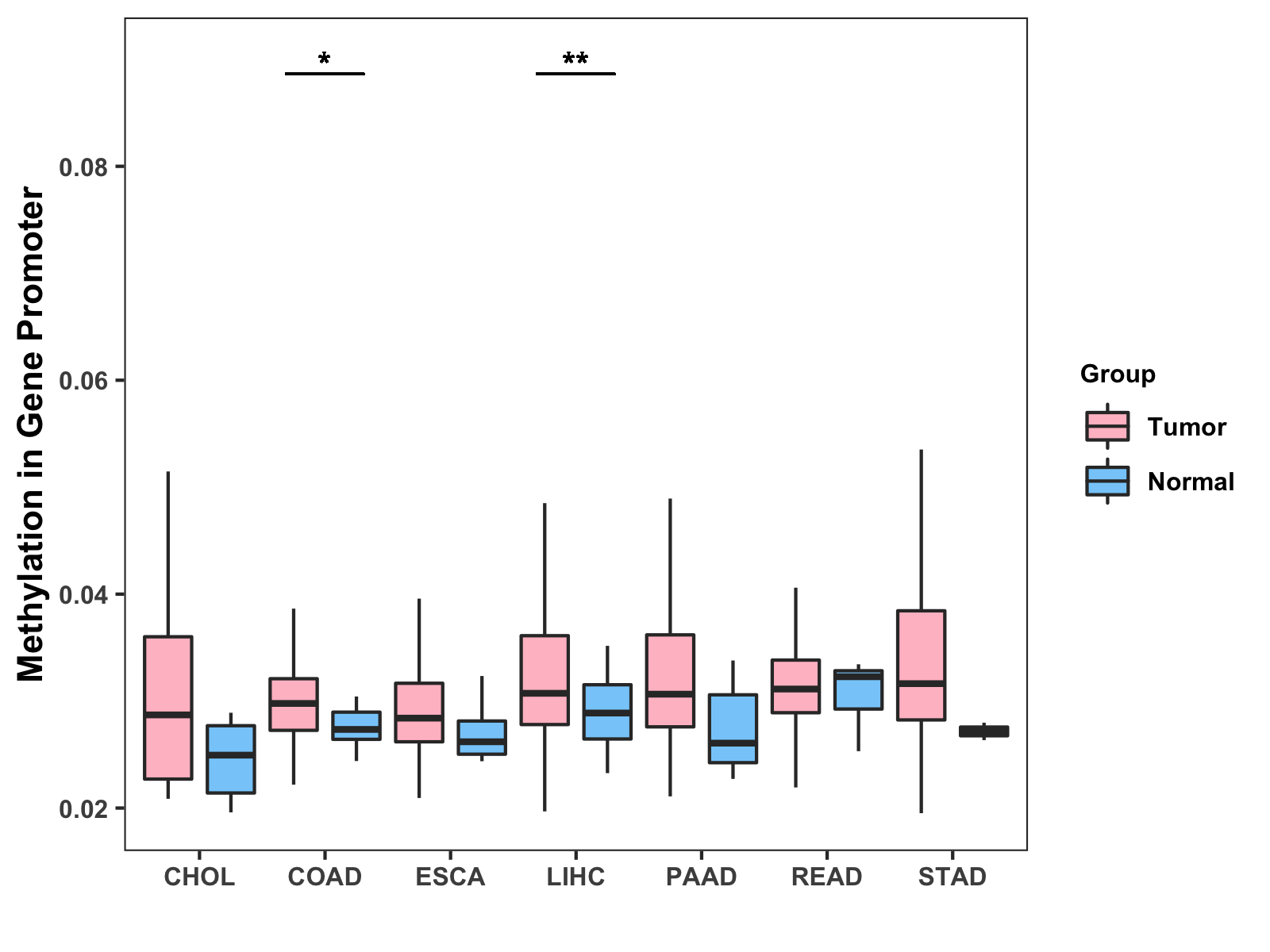 Boxplot of All Gastrointestinal Cancer ( * : 0.01-0.05 , ** : 0.005-0.01 , *** : 0.0001-0.005 , **** : < 0.0001 ) |