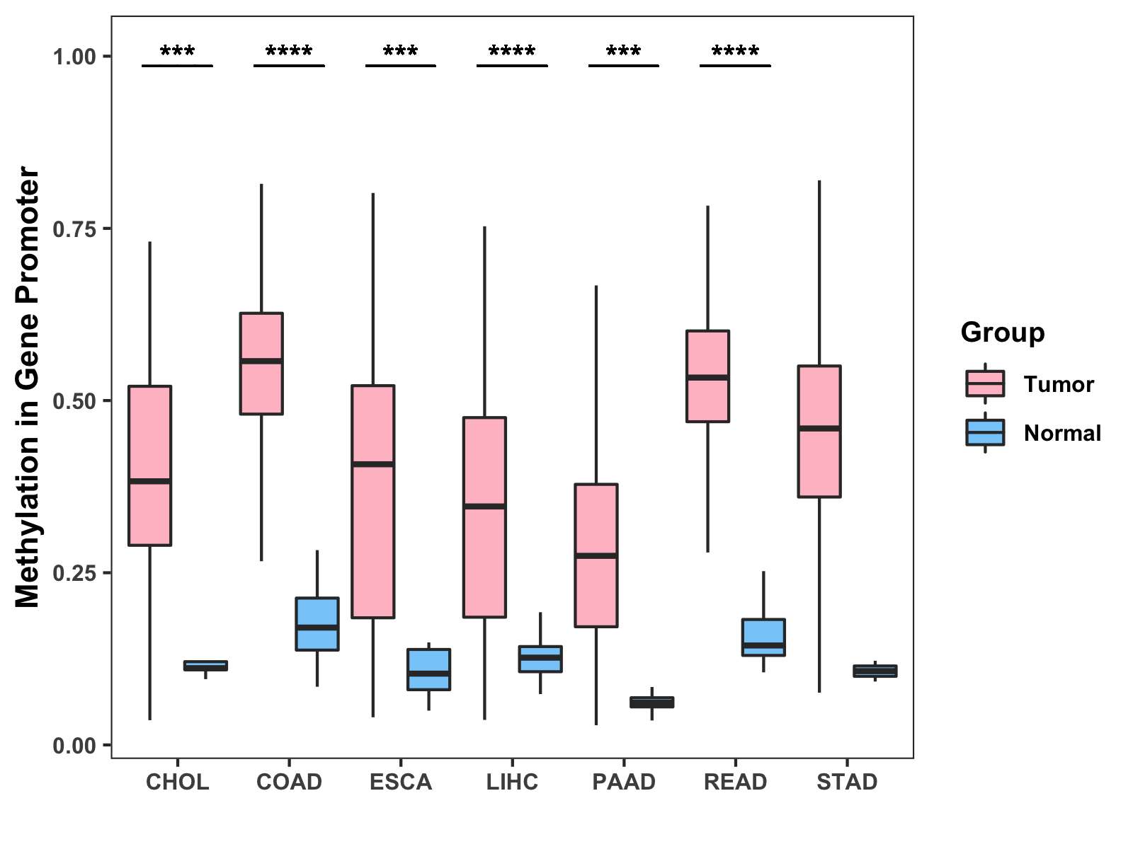 Boxplot of All Gastrointestinal Cancer ( * : 0.01-0.05 , ** : 0.005-0.01 , *** : 0.0001-0.005 , **** : < 0.0001 ) |