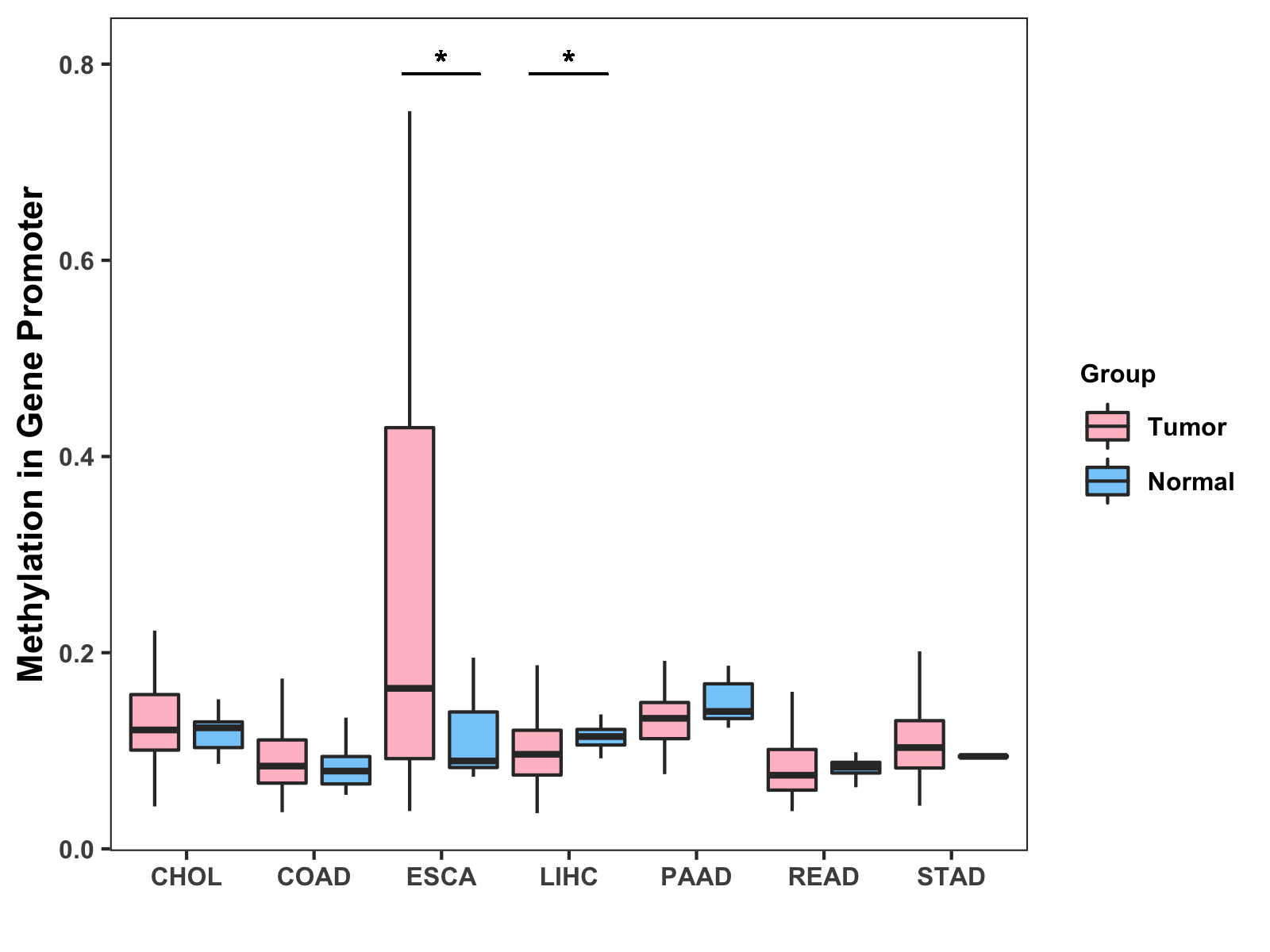 Boxplot of All Gastrointestinal Cancer ( * : 0.01-0.05 , ** : 0.005-0.01 , *** : 0.0001-0.005 , **** : < 0.0001 ) |