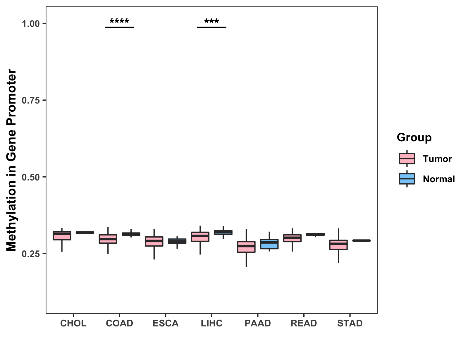 Boxplot of All Gastrointestinal Cancer ( * : 0.01-0.05 , ** : 0.005-0.01 , *** : 0.0001-0.005 , **** : < 0.0001 ) |