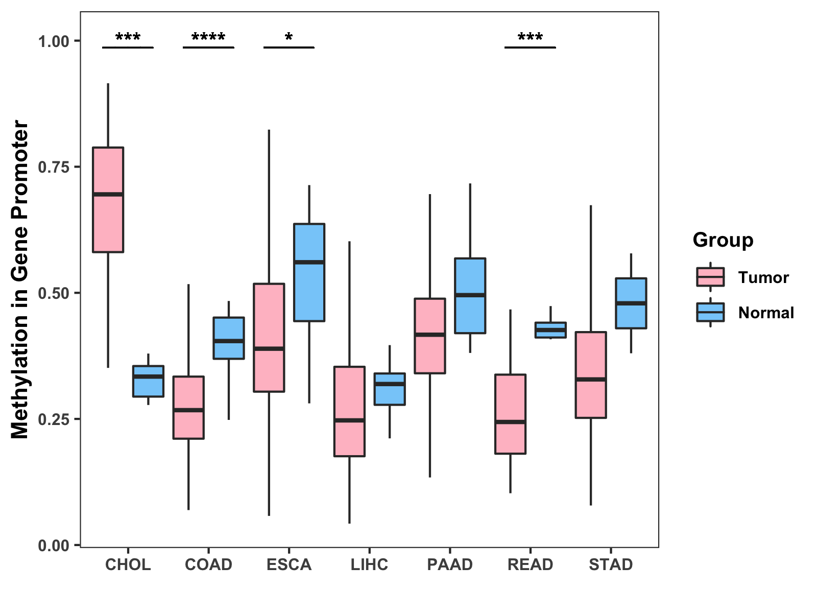 Boxplot of All Gastrointestinal Cancer ( * : 0.01-0.05 , ** : 0.005-0.01 , *** : 0.0001-0.005 , **** : < 0.0001 ) |